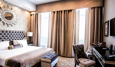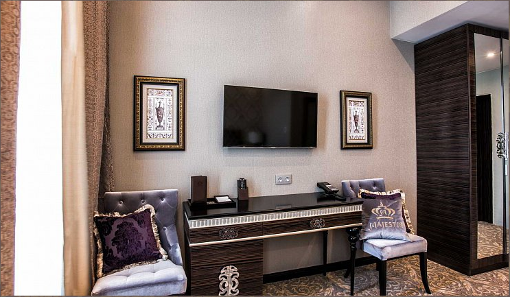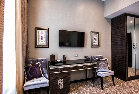 В номере: диван, зеркало, кровать двуспальная, прикроватные тумбочки, стол, стул, шкаф, кофемашина, мини-холодильник, сейф, система общего кондиционирования, телевизор ЖК, телефон, чайная станция