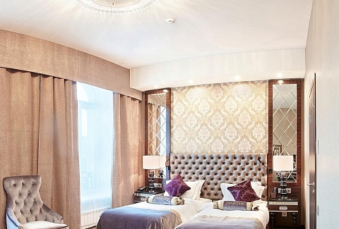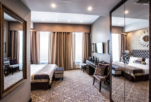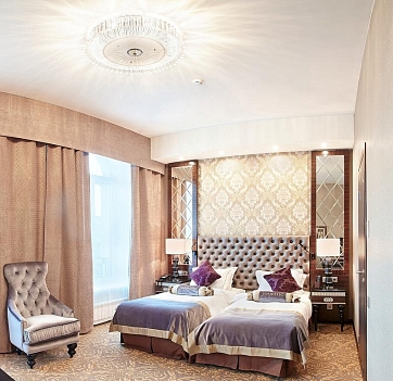 В номере: диван, зеркало, кровати односпальные /одна двуспальная кровать, прикроватные тумбочки, стол, стул, шкаф, кофемашина, мини-холодильник, сейф, система общего кондиционирования, телевизор ЖК, телефон, чайная станция