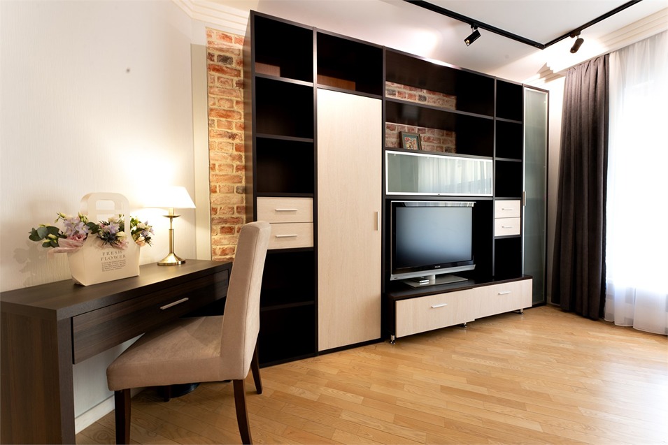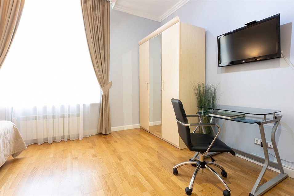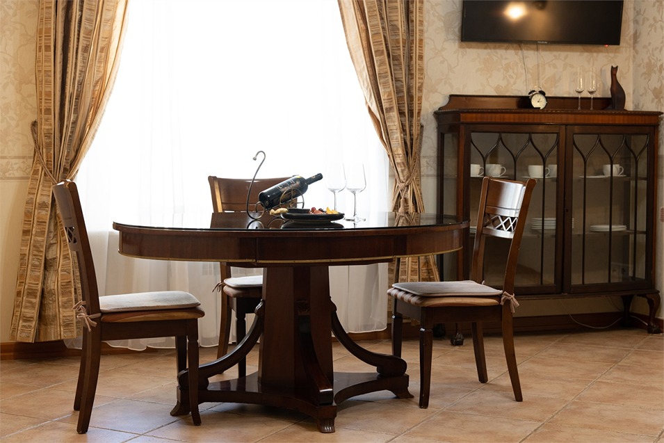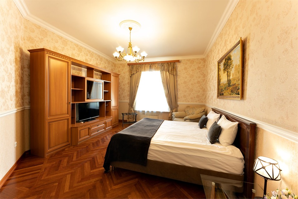 В номере: вешалка, зеркало, кресло, кровать двуспальная, прикроватные тумбочки, стол, стулья, шкаф, гладильная доска, духовой шкаф, микроволновая печь, набор посуды, плита электрическая, сейф, телевизор, холодильник, электрочайник