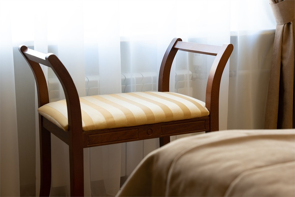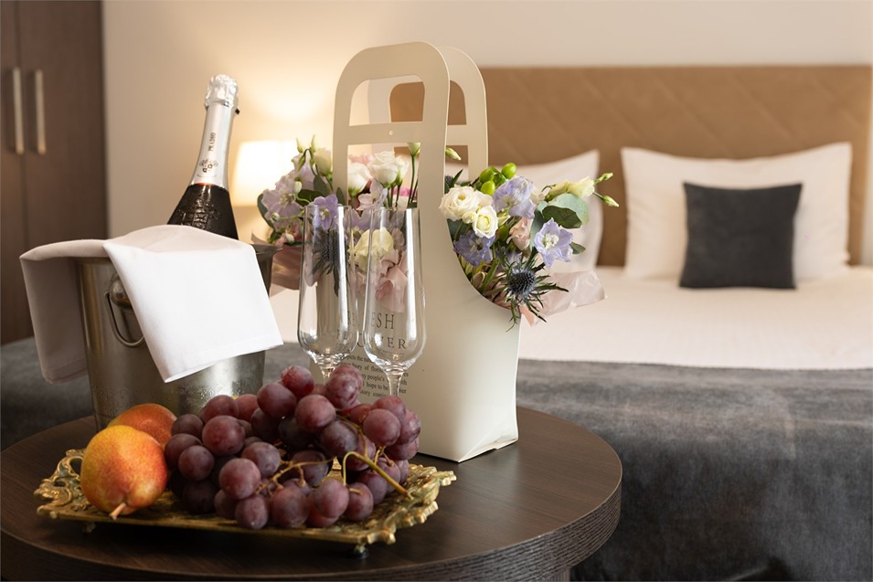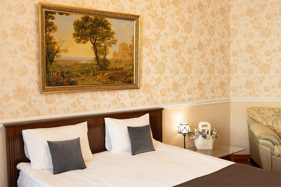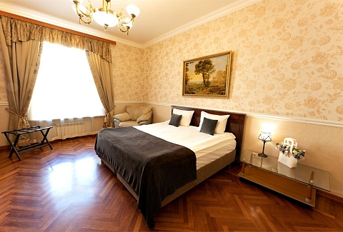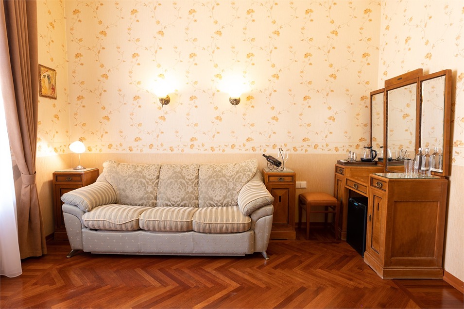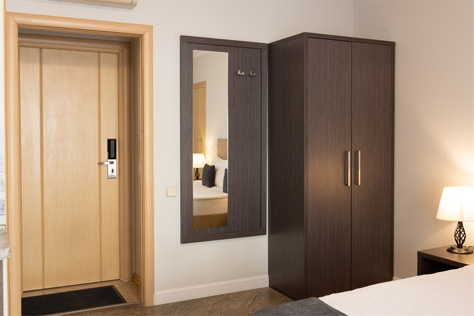 В номере: вешалка, диван раскладной, зеркало, кровать двуспальная, прикроватные тумбочки, стол, стулья, шкаф, гладильная доска, кондиционер, сейф, телевизор, утюг, чайная станция, чайный набор посуды