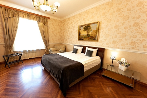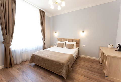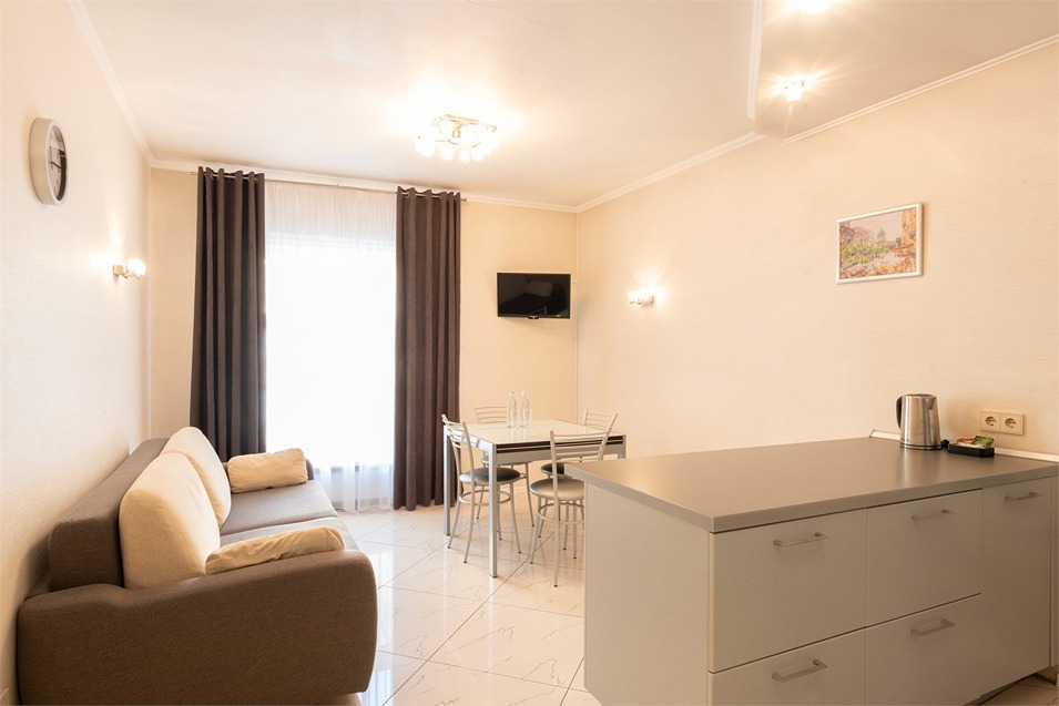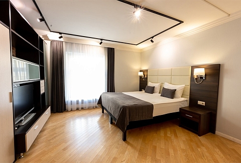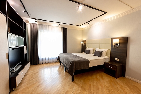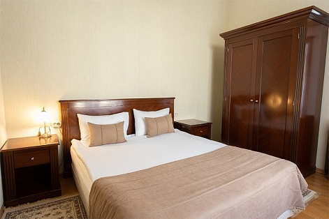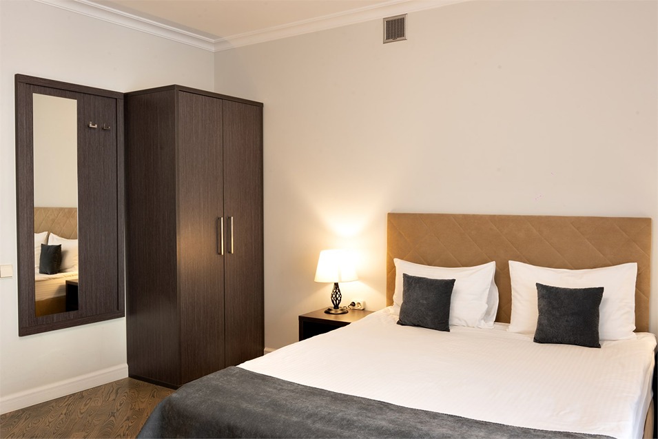 В номере: вешалка, диван раскладной, зеркало, кровать двуспальная, прикроватные тумбочки, стол, стулья, шкаф, гладильная доска, духовой шкаф, кондиционер, микроволновая печь, набор посуды, плита электрическая, сейф, телевизор, утюг, холодильник, электрочайник