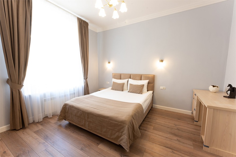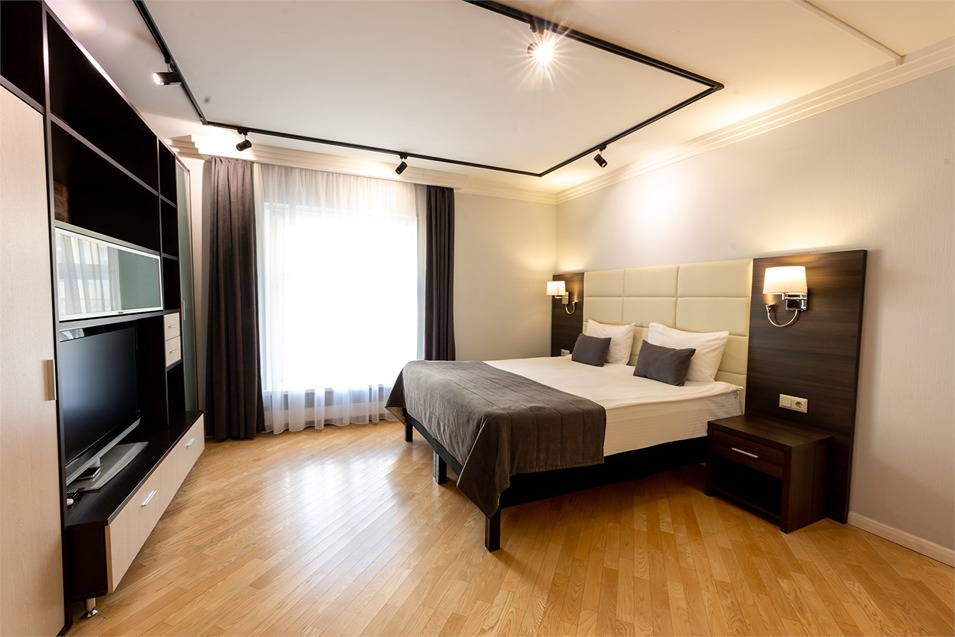 В номере: вешалка, зеркало, кровать двуспальная, прикроватные тумбочки, стол, стулья, шкаф, гладильная доска, кондиционер, микроволновая печь, набор посуды, плита электрическая, посудомоечная машина, сейф, стиральная машина, телевизор, утюг, холодильник, электрочайник