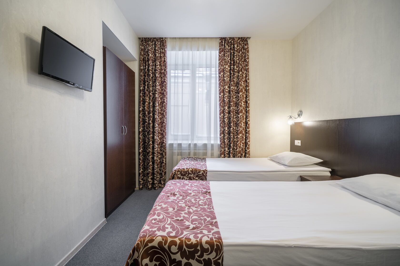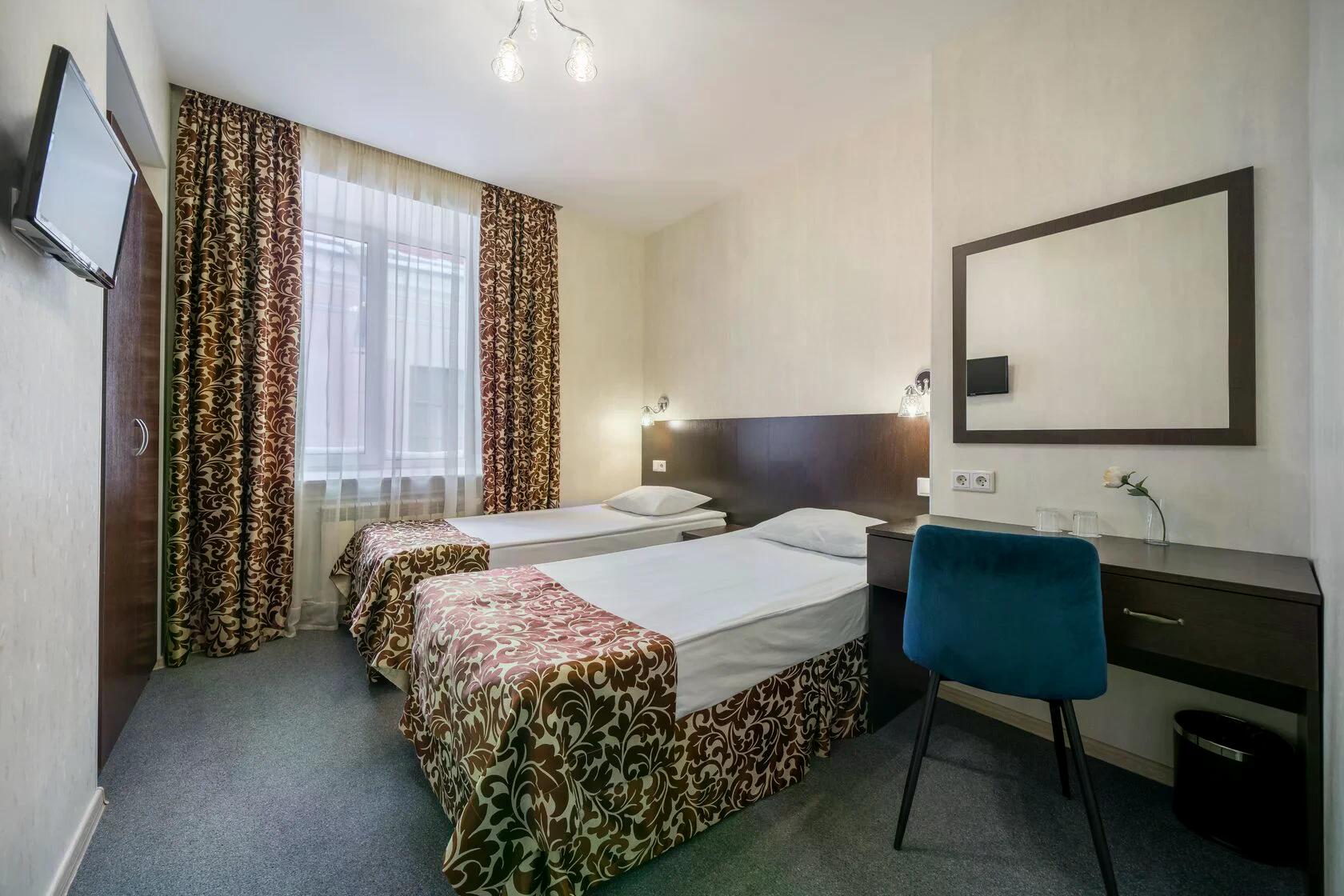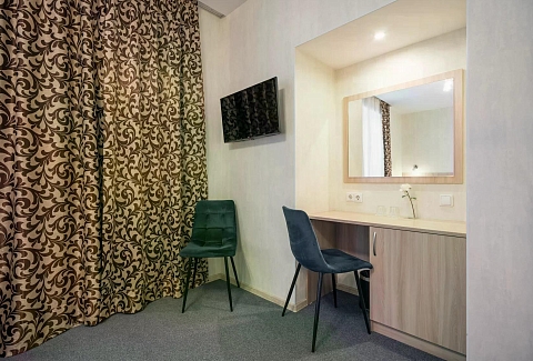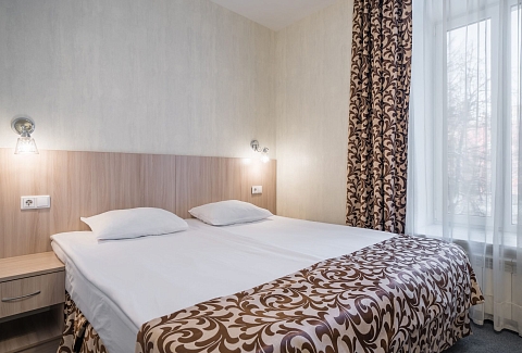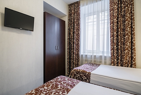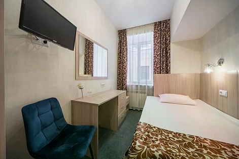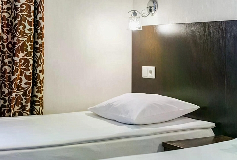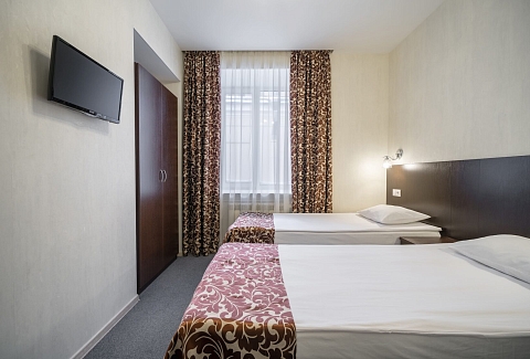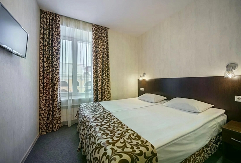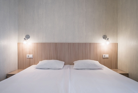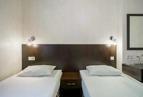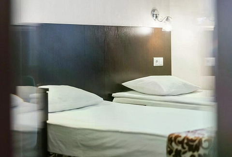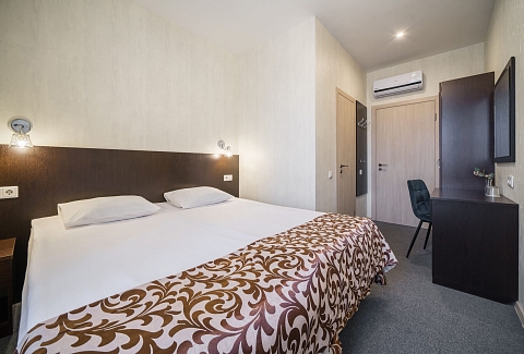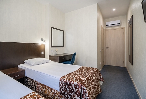 В номере: кровати односпальные /одна двуспальная кровать, прикроватная тумбочка, стол, стул, шкаф, кондиционер, телевизор ЖК