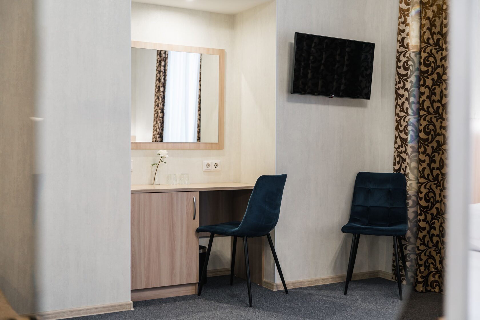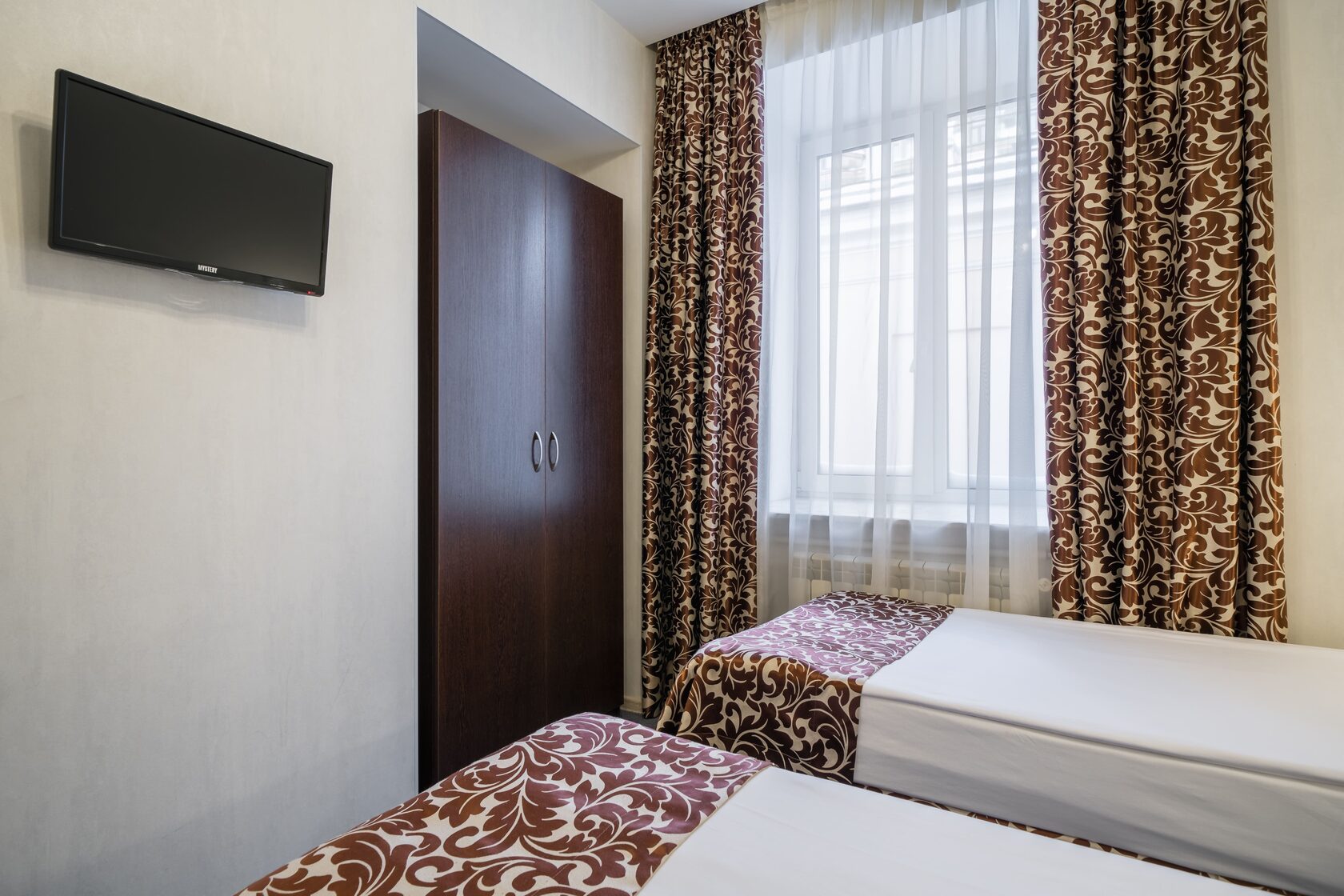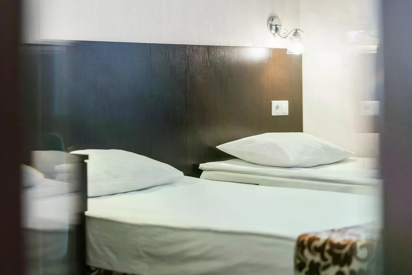 В номере: кровати односпальные /одна двуспальная кровать, прикроватная тумбочка, стол, стул, шкаф, кондиционер, телевизор ЖК