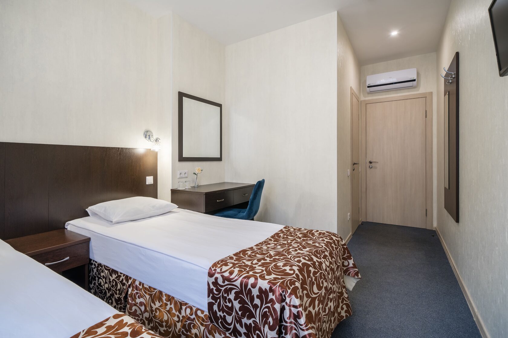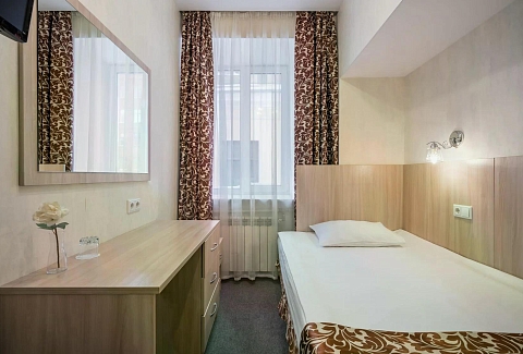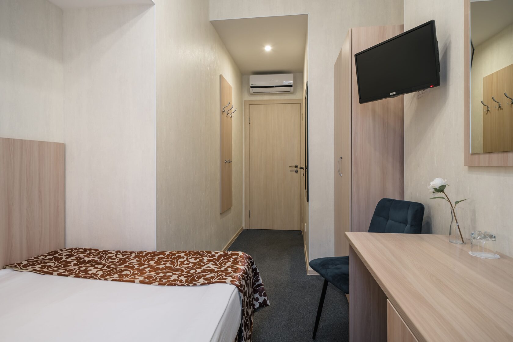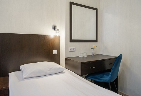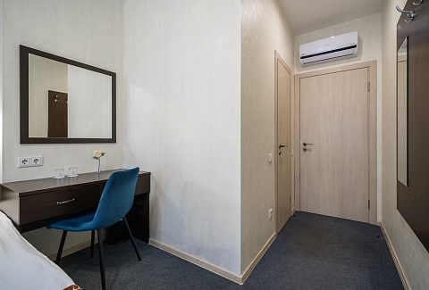 В номере: кровать односпальная, прикроватная тумбочка, стол, стул, шкаф, кондиционер