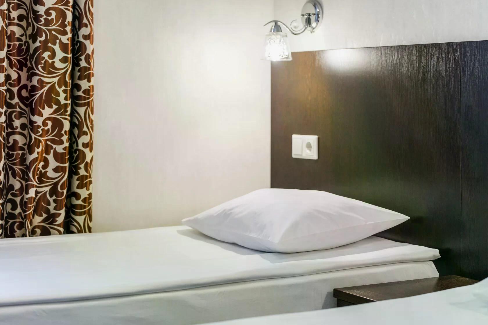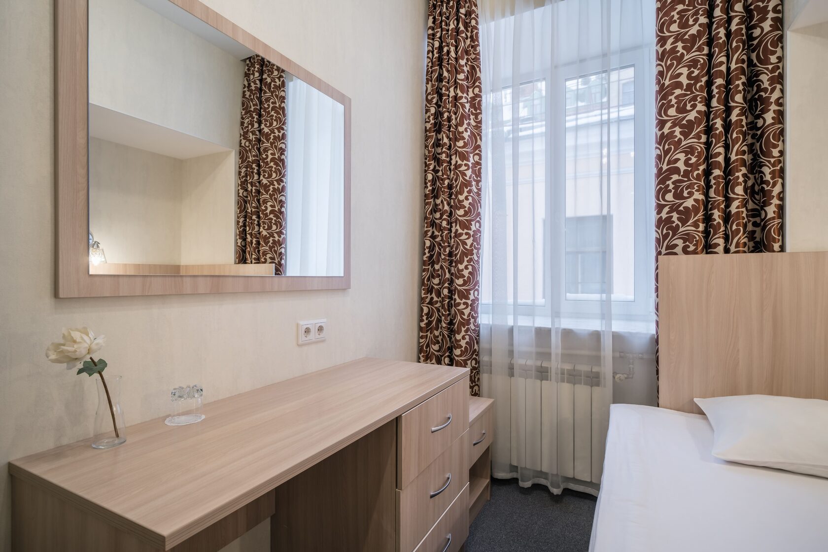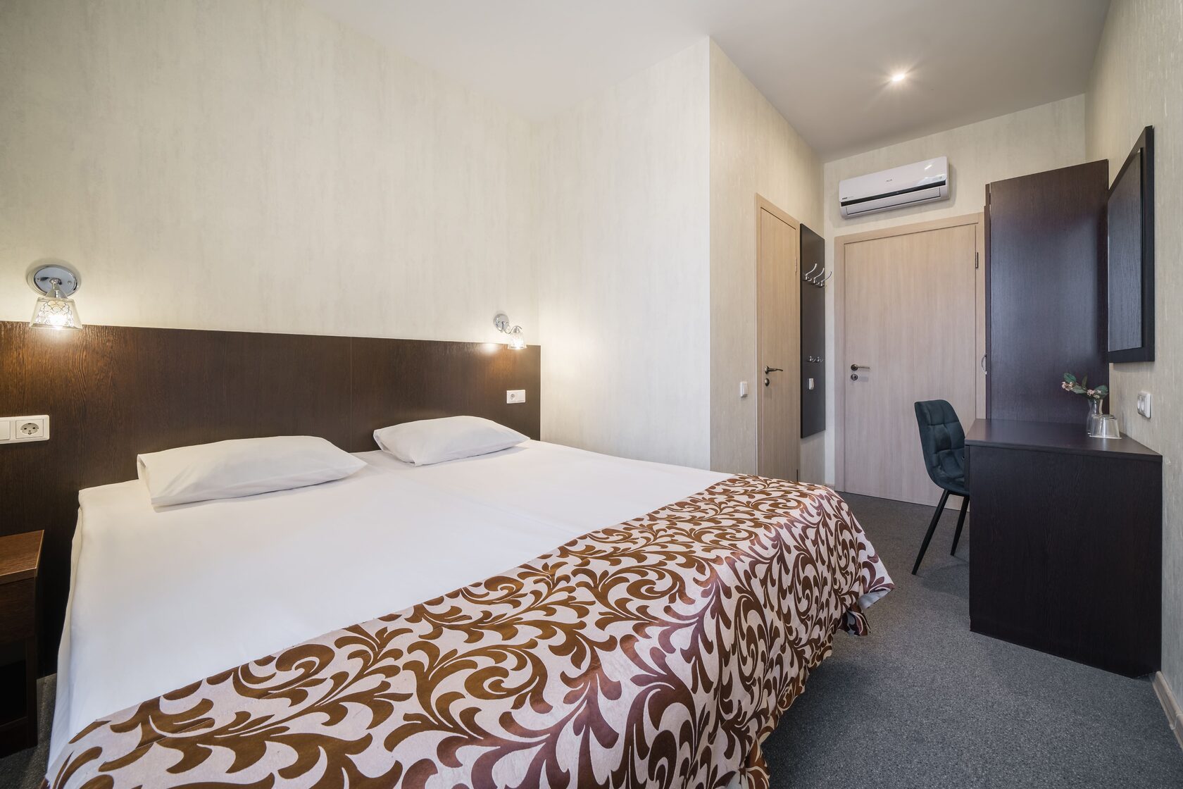 В номере: кровать односпальная, прикроватная тумбочка, стол, стул, шкаф, кондиционер