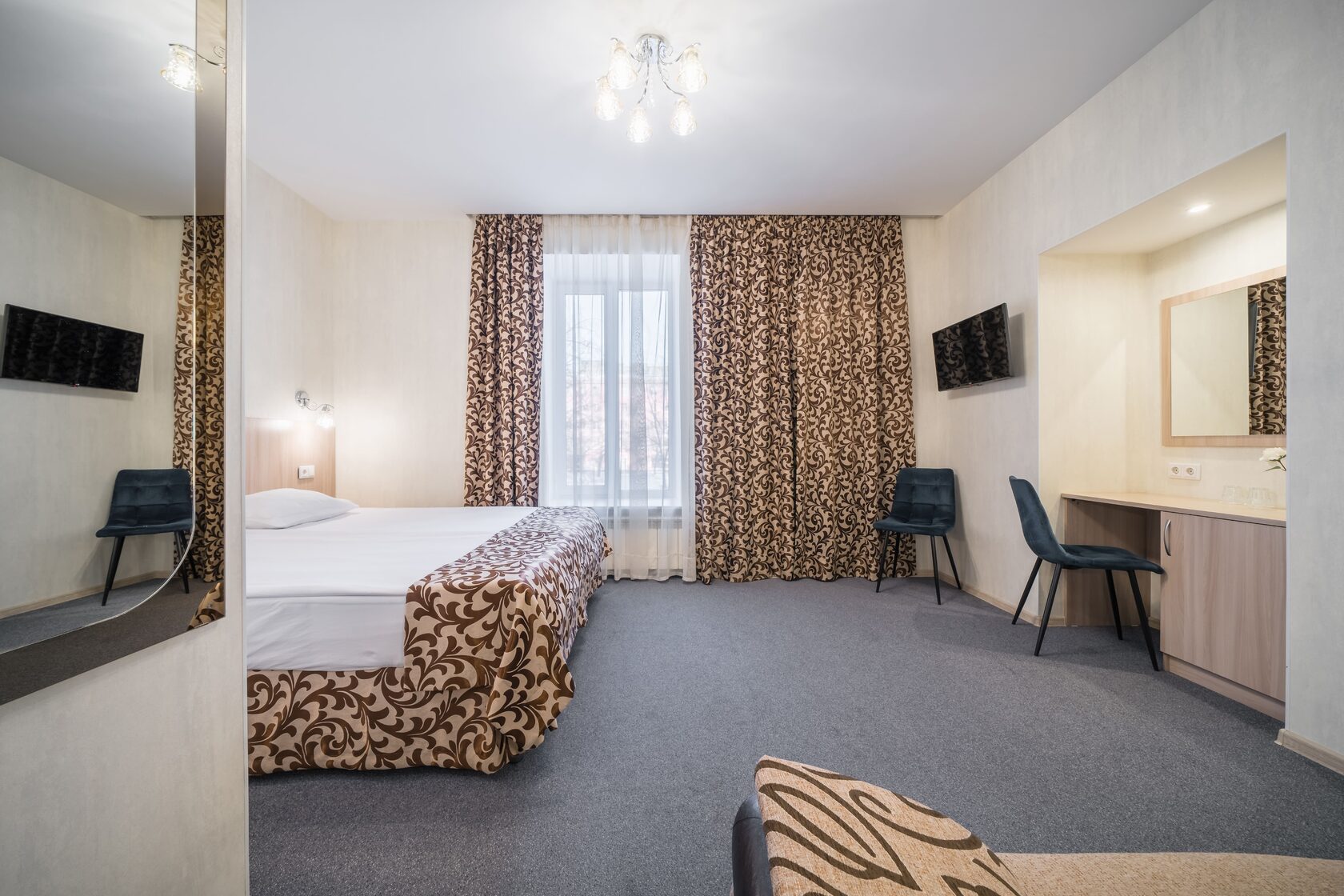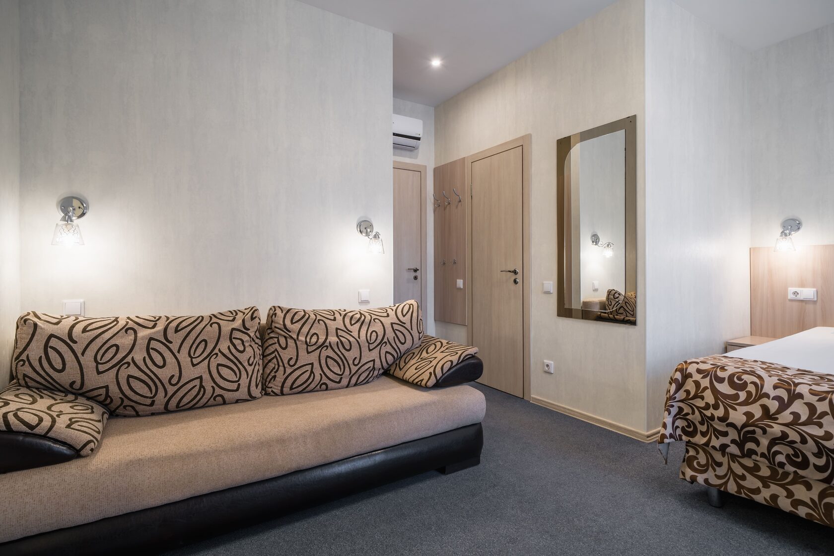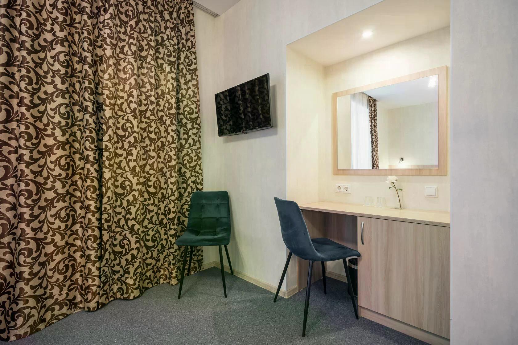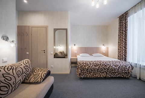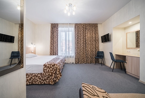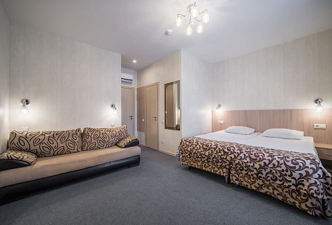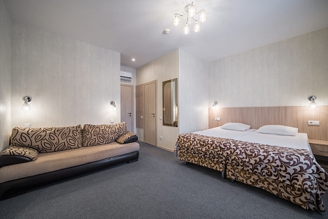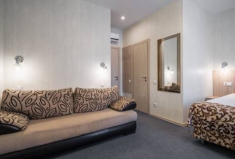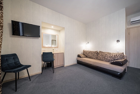 В номере: диван, кровать двуспальная, прикроватные тумбочки, стол, стул, шкаф, кондиционер, мини-холодильник, телевизор ЖК