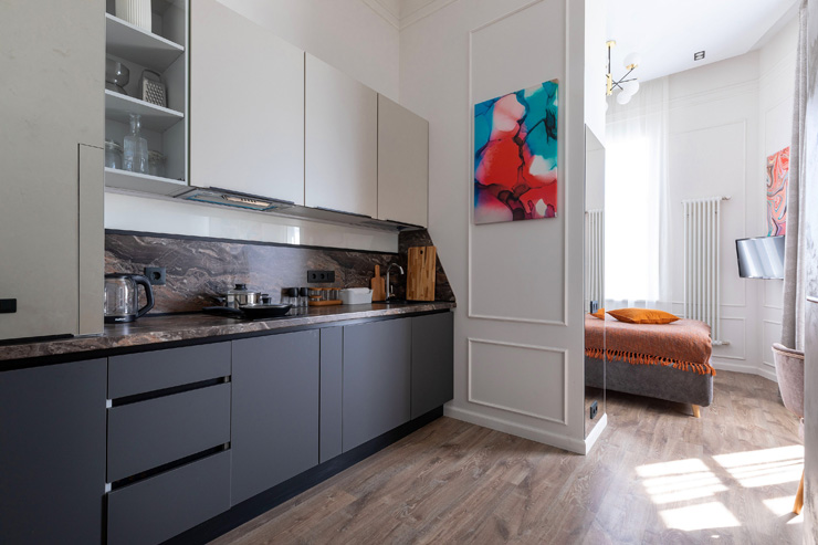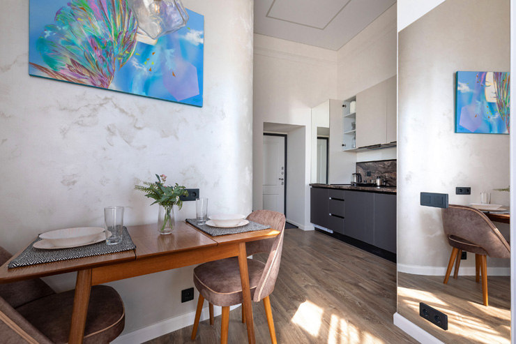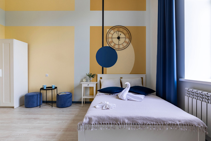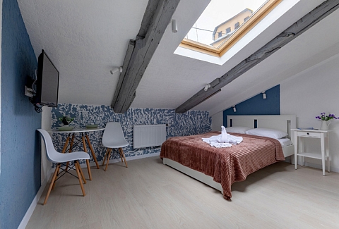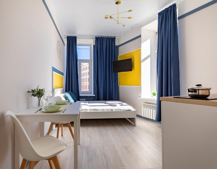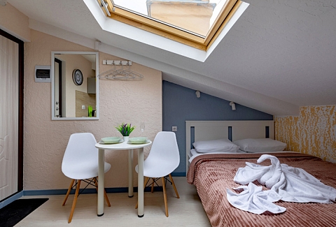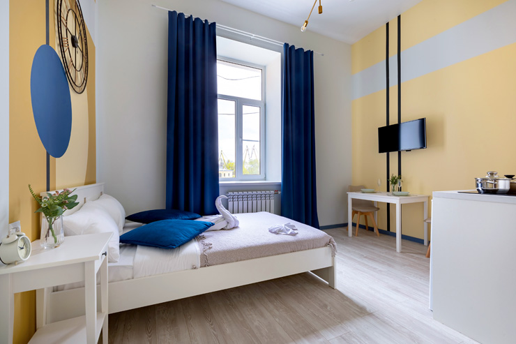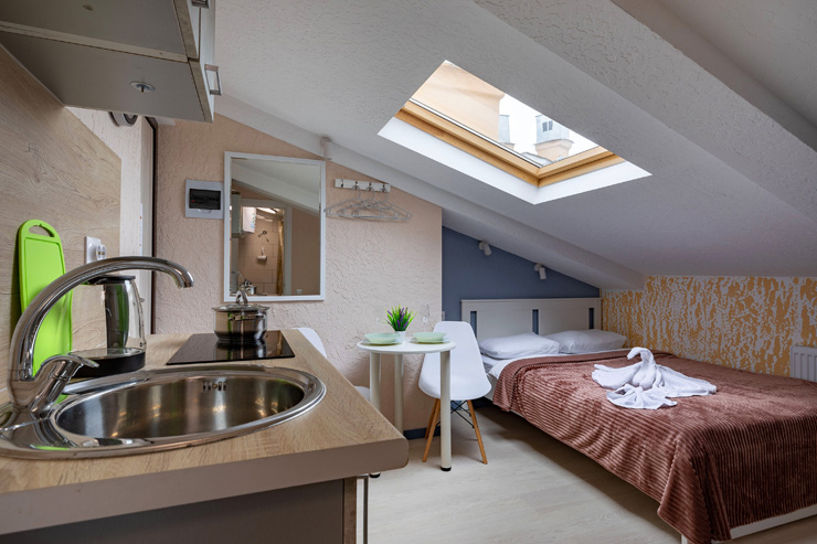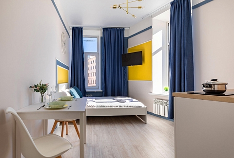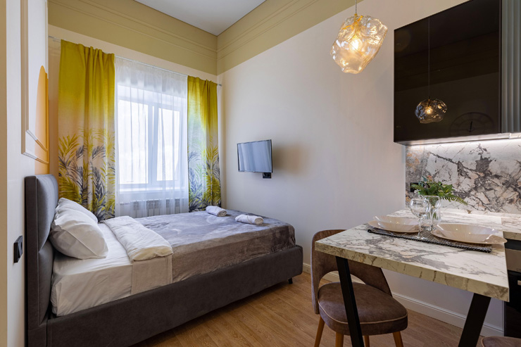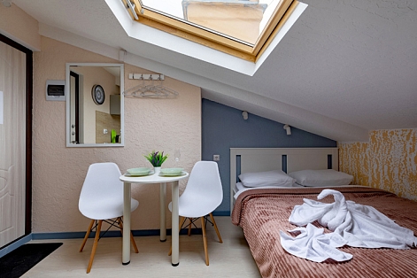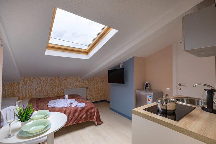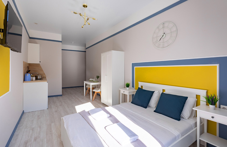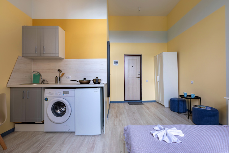 Апарт-отель предлагает гостям разместиться в одном из 77 просторных и уютных номеров, каждый из которых оснащен удобной мебелью, новейшей техникой и персональной ванной комнатой с душевой кабиной. Для комфорта предоставляются гладильные и стиральные принадлежности. Также в каждом номере отдыхающие найдут набор посуды, кухонный гарнитур с электроплитой, обеденную зону и чайный сервиз.