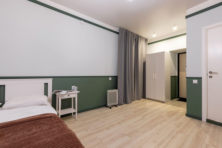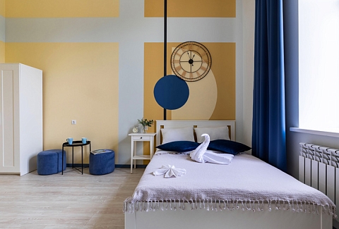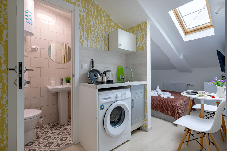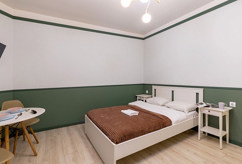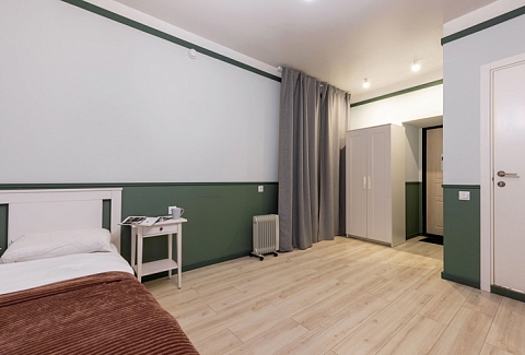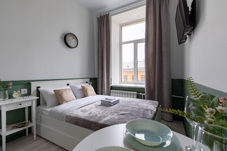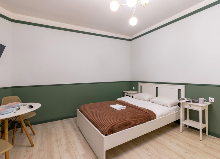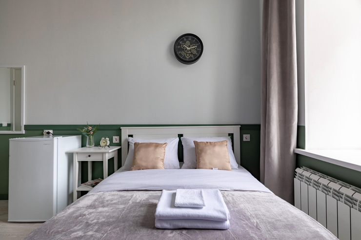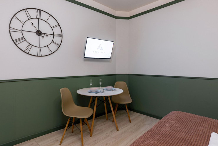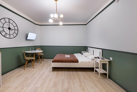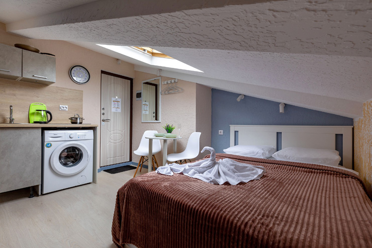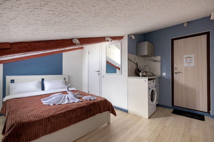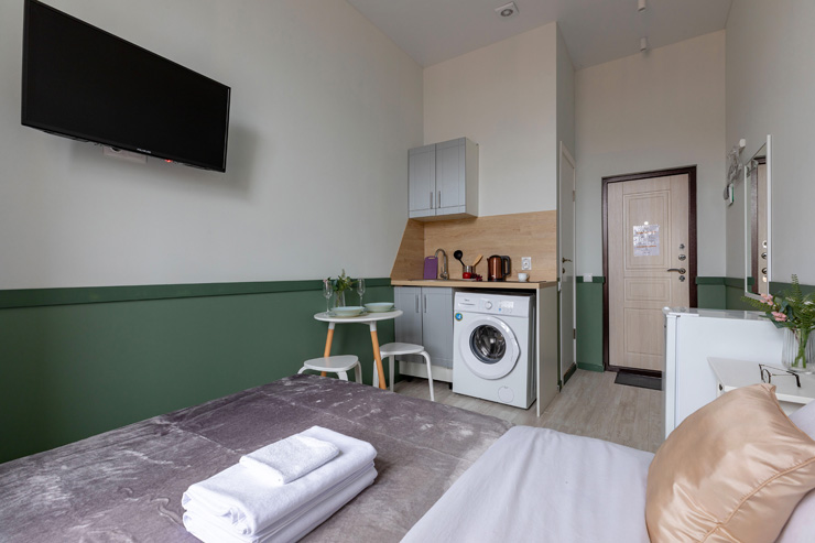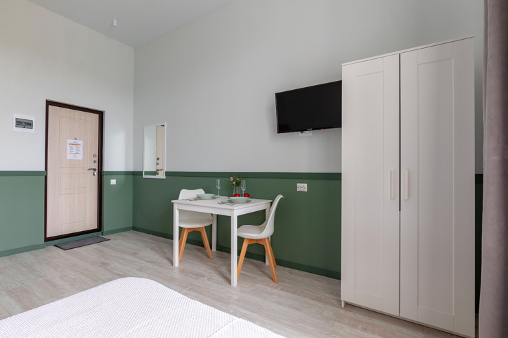 В номере: вешалка, зеркало, кровать двуспальная, стол, стулья, шкаф, гладильная доска, мини-холодильник, набор посуды, плита электрическая, стиральная машина, телевизор, утюг, электрочайник