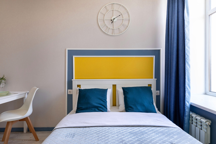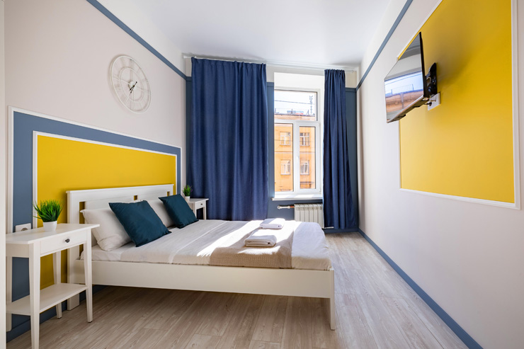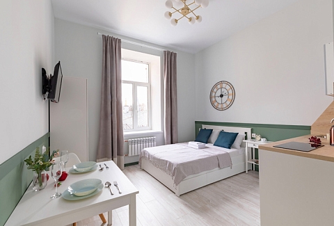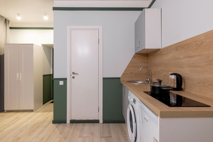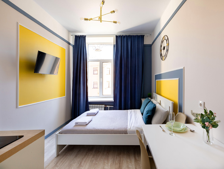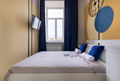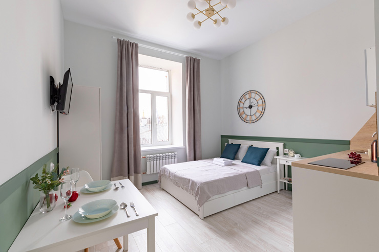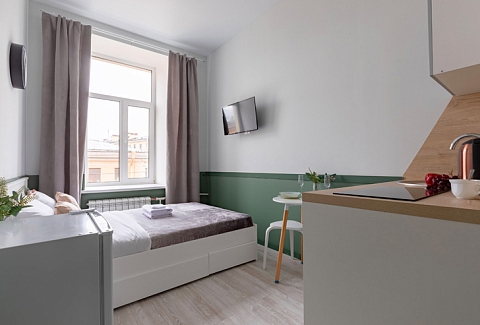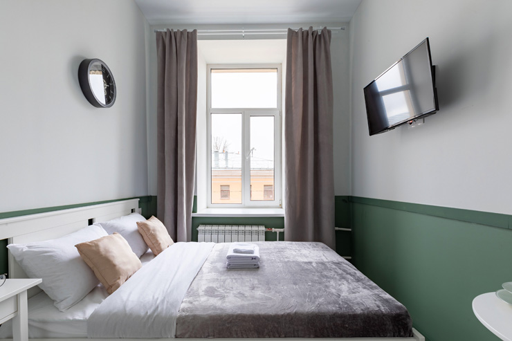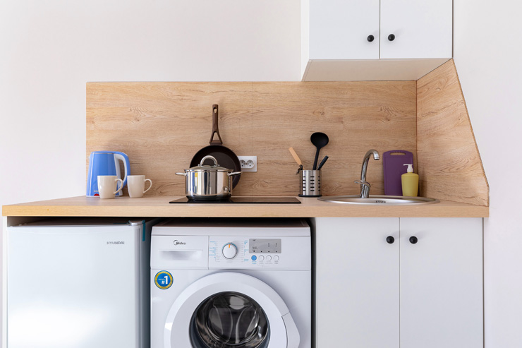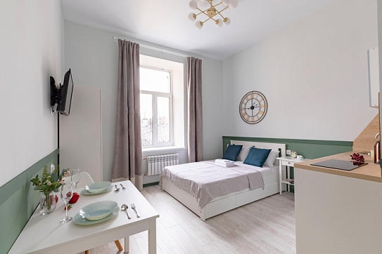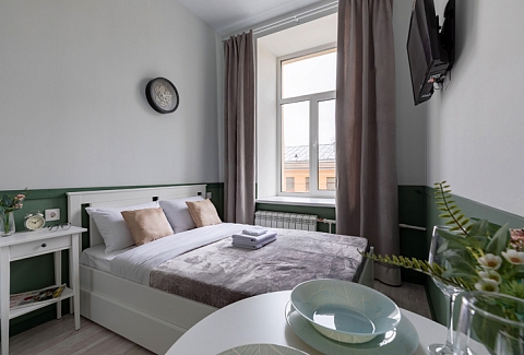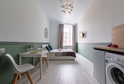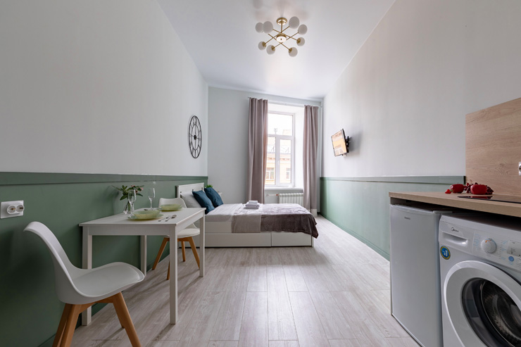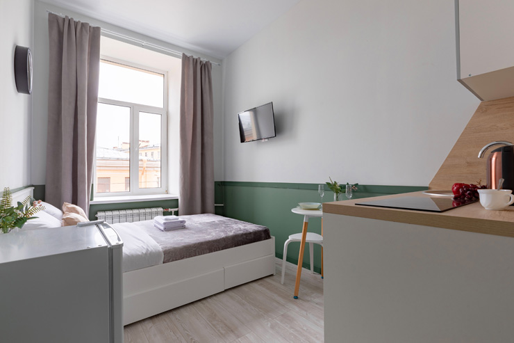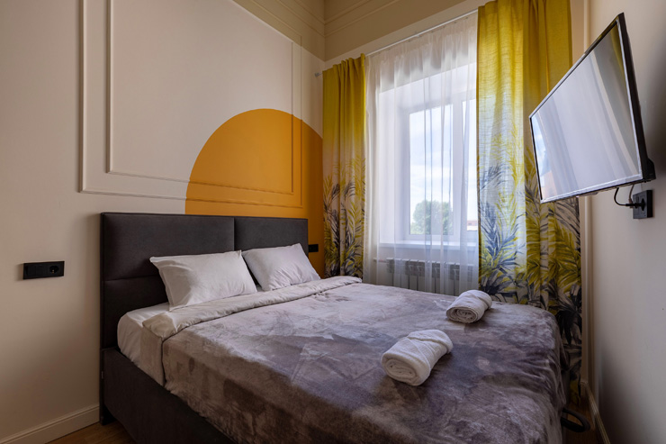 В номере: вешалка, зеркало, кровать двуспальная, стол, стулья, шкаф, гладильная доска, мини-холодильник, набор посуды, плита электрическая, стиральная машина, телевизор, утюг, электрочайник