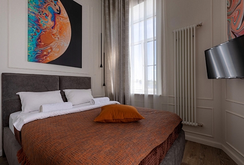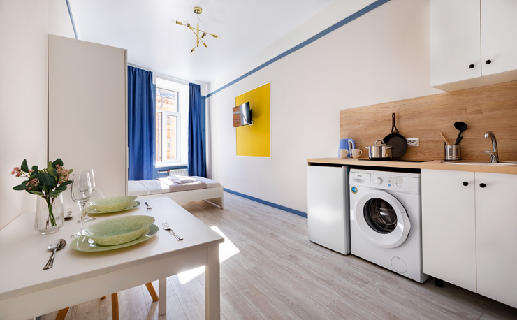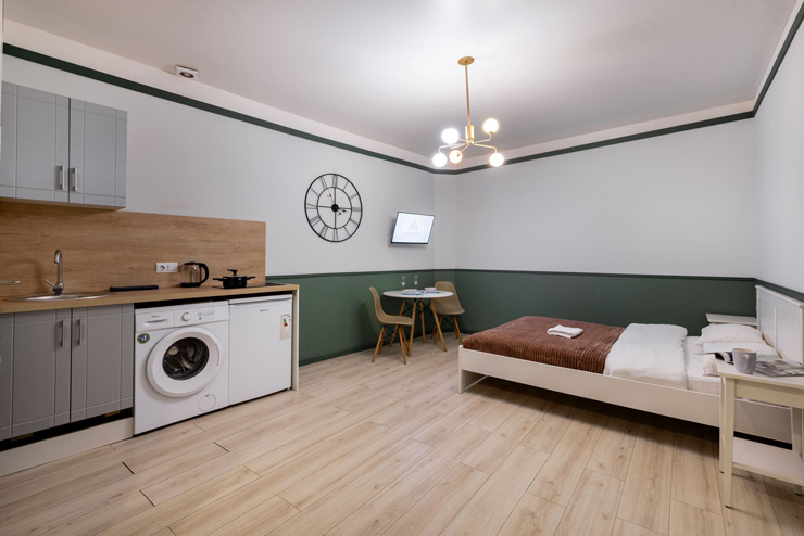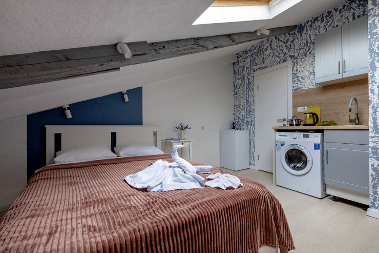 В номере: вешалка, зеркало, кровать двуспальная, прикроватные тумбочки, стол, стулья, шкаф, мини-холодильник, набор посуды, плита электрическая, посудомоечная машина, стиральная машина, телевизор, утюг, электрочайник