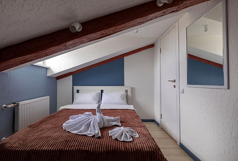 В номере: вешалка, зеркало, кровать двуспальная, стол, стулья, мини-холодильник, набор посуды, плита электрическая, стиральная машина, телевизор, утюг, электрочайник