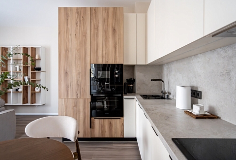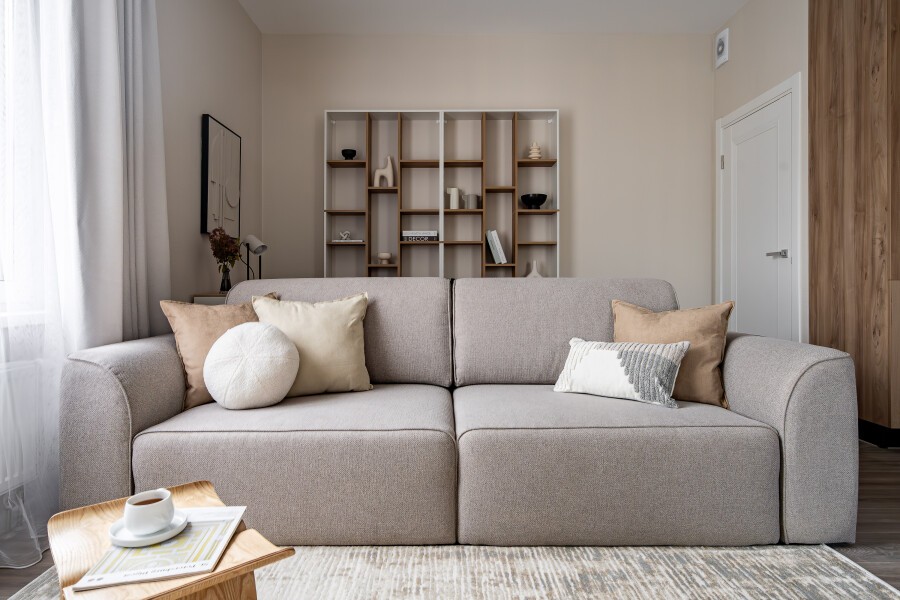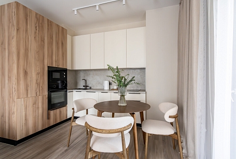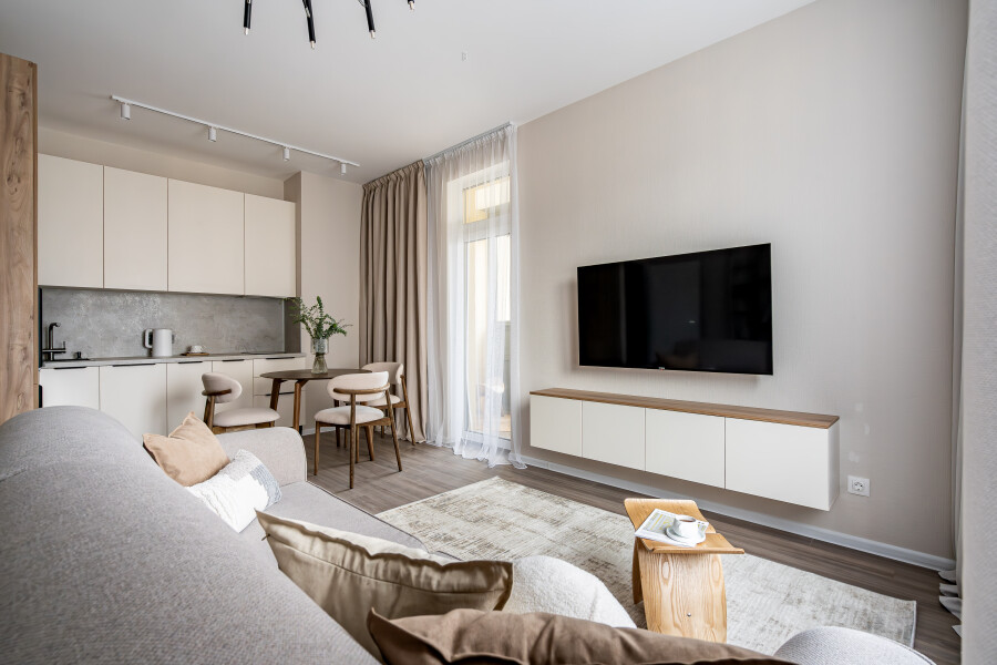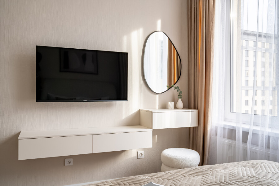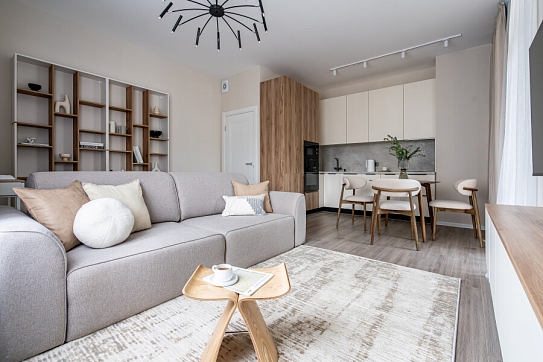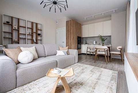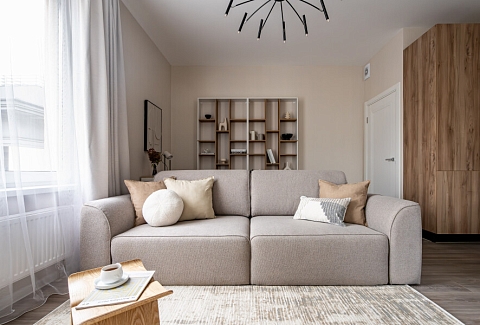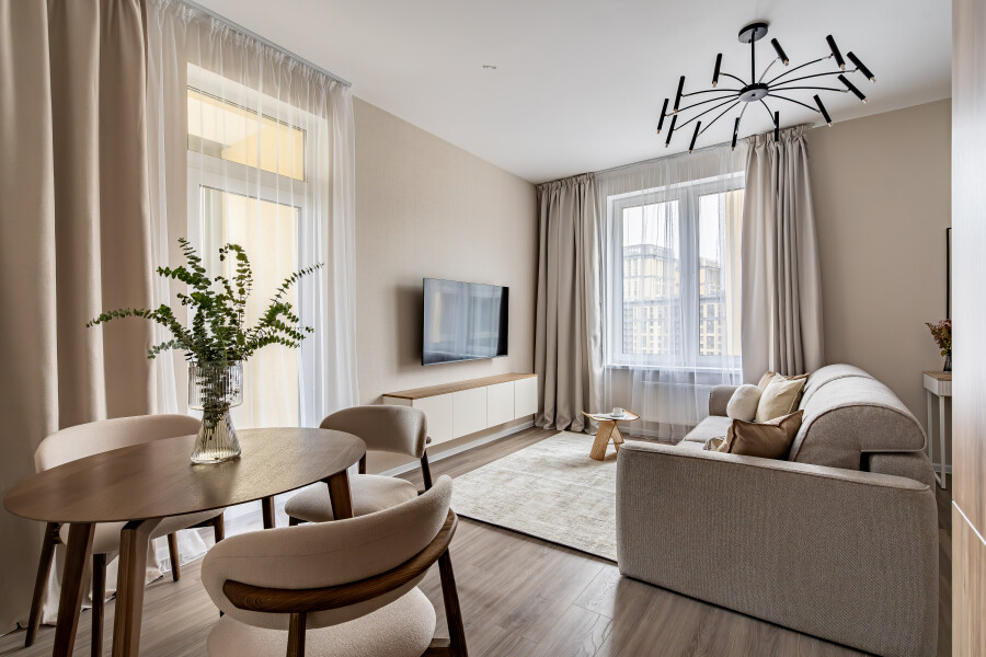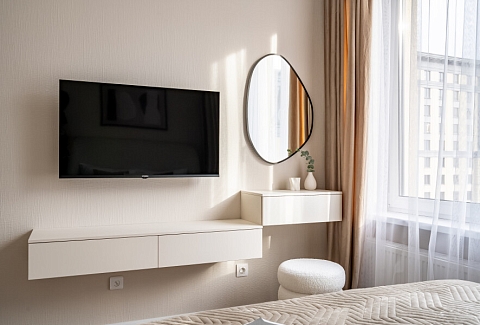 В номере: вешалка, диван раскладной, кровать двуспальная, прикроватная тумбочка, пуфик, столик кофейный, столик туалетный, стол обеденный, стулья, шкаф, гладильная доска, духовой шкаф, микроволновая печь, набор посуды, плита индукционная, стиральная машина, сушилка для белья, телевизор ЖК, утюг, холодильник, чайный набор посуды, электрочайник