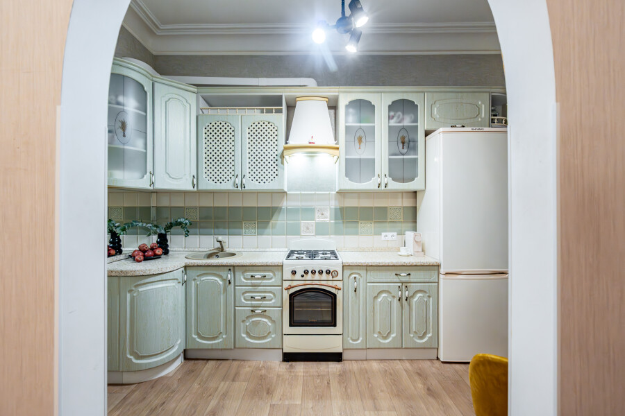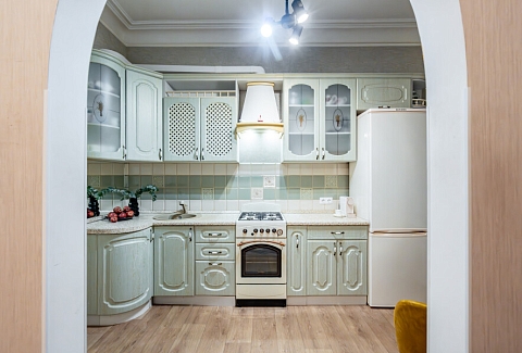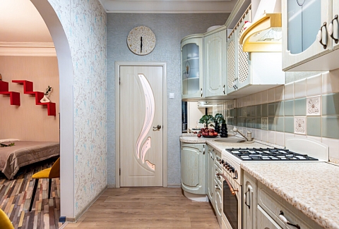 В номере: вешалка, диван раскладной, зеркало, комод, кресло, кровать двуспальная, кухонная мебель, прикроватные тумбочки, стол для компьютера, столик кофейный, стол обеденный, стулья, тумба, шкаф, гладильная доска, духовой шкаф, микроволновая печь, набор посуды, плита газовая, стиральная машина, сушилка для белья, телевизор, утюг, холодильник, чайник, чайный набор посуды