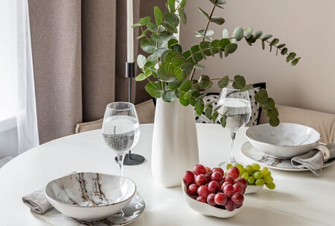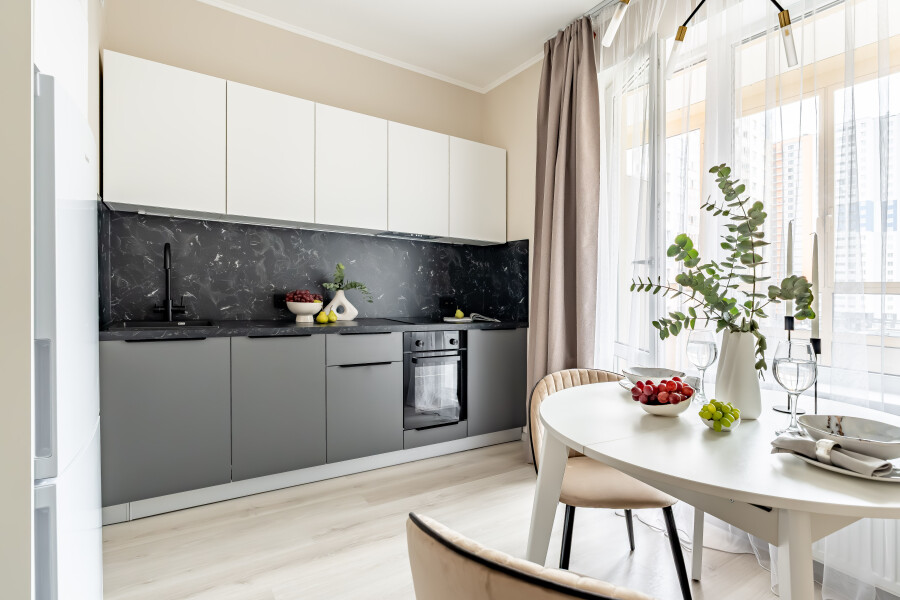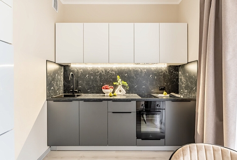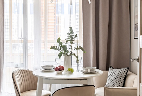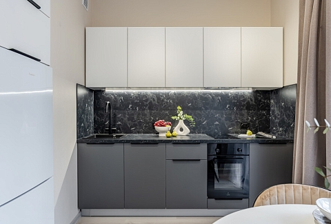 В номере: вешалка, диван раскладной, зеркало, кровать двуспальная, кухонная мебель, прикроватная тумбочка, столик кофейный, столик туалетный, стол обеденный, стулья, шкаф, гладильная доска, духовой шкаф, кофемашина, микроволновая печь, набор посуды, плита индукционная, стиральная машина, сушилка для белья, телевизор ЖК, утюг, холодильник, чайный набор посуды, электрочайник