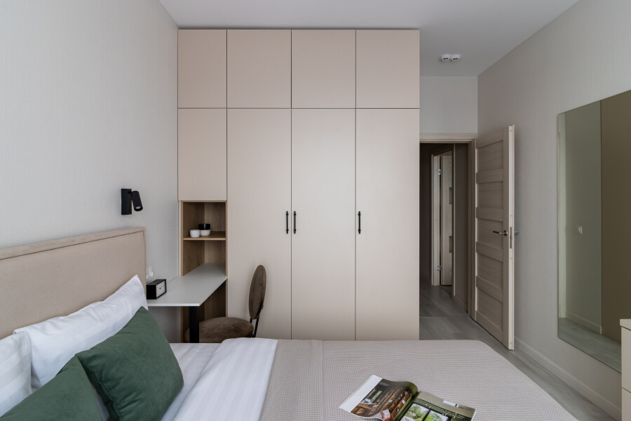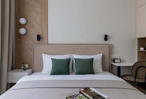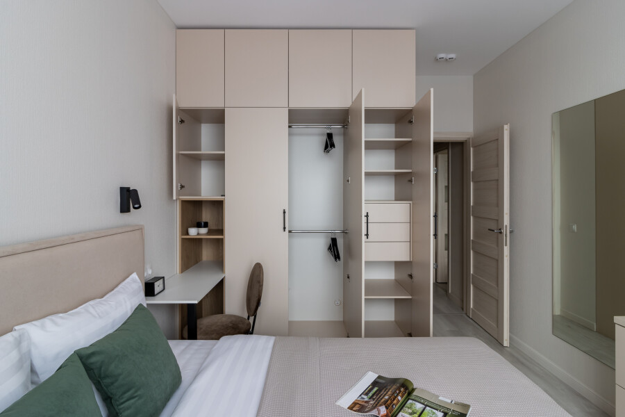 В номере: вешалка, диван раскладной, зеркало, кровать двуспальная, прикроватные тумбочки, стол, стулья, шкаф, духовой шкаф, кондиционер, кофемашина, микроволновая печь, набор посуды, плита электрическая, посудомоечная машина, стиральная машина, телевизор, утюг, холодильник, электрочайник