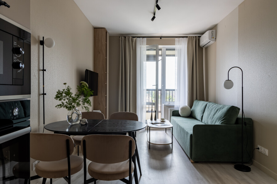 На первом этаже открыт продуктовый супермаркет.Изолированная спальня укомплектована двуспальной кроватью напротив телевизора, вместительным шкафом, большим зеркалом. Кухня-гостиная располагает полноценным пространством для приготовления еды, обеденной зоной со столом и мягкими стульями, диваном и вторым телевизором. Есть выход на видовой балкон с мягким креслом и кофейным столиком. Совмещенный санузел оборудован ванной и стиральной машиной. Работают Wi-Fi и Smart TV. По согласованию возможен заезд с питомцем.