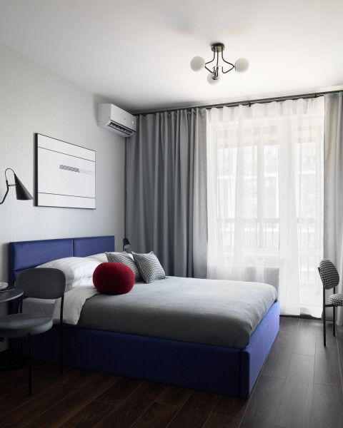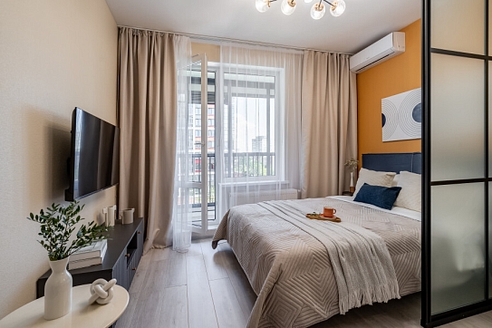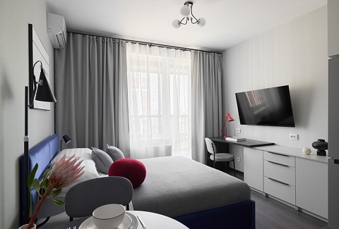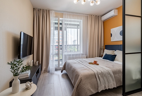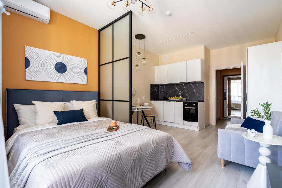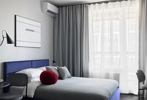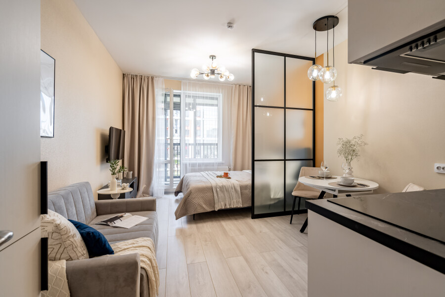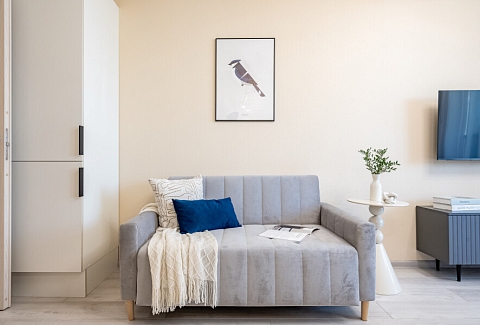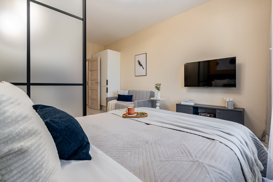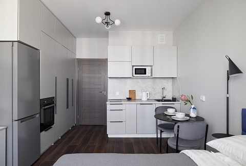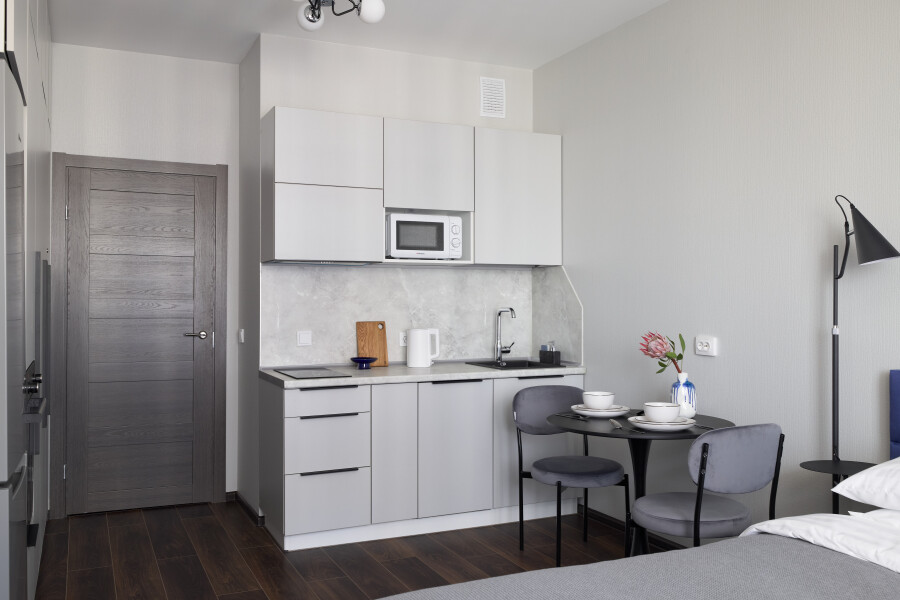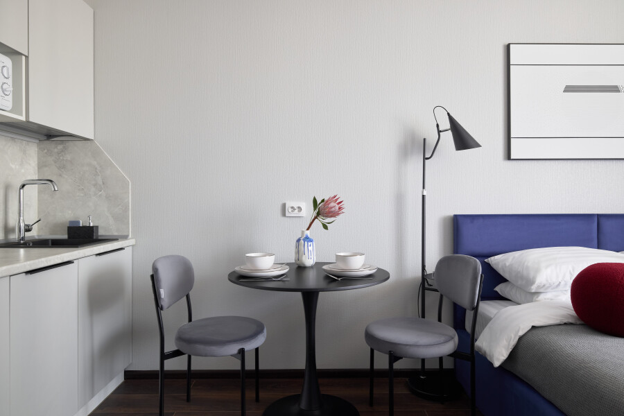 На первом этаже работают продуктовый магазин и кофейня.Номерной фонд включает 2 уютные студии. Каждая располагает двуспальной кроватью, мини-кухней с обеденной зоной, посудомоечной и стиральной машинами, балконом с лаундж-зоной. Одна дополнена раскладным диваном в качестве дополнительного спального места. Гостям доступны Wi-Fi и Smart TV. По согласованию возможен заезд с домашним животным.