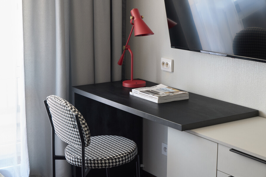 В номере: вешалка, зеркало, кровать двуспальная, стол, стулья, духовой шкаф, кондиционер, микроволновая печь, набор посуды, плита электрическая, посудомоечная машина, стиральная машина, сушилка для белья, телевизор, утюг, электрочайник