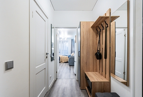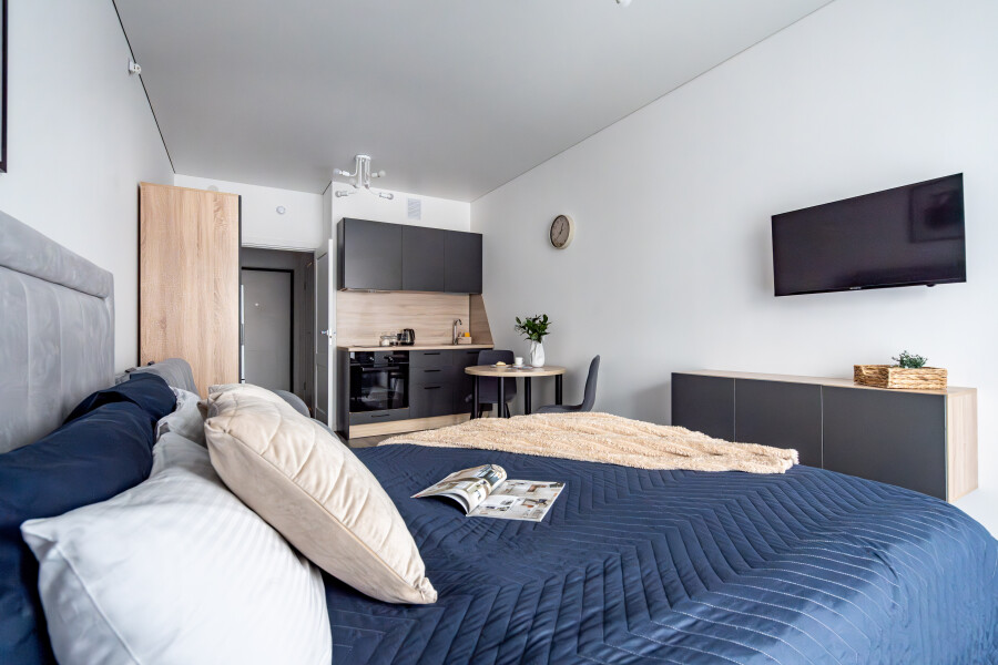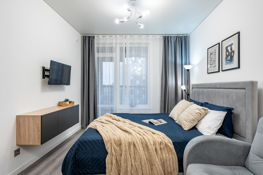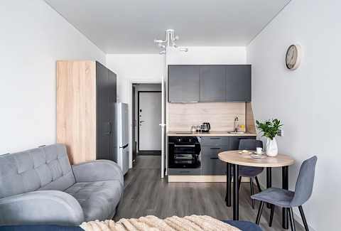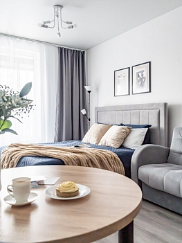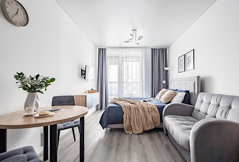 Апартаменты «Merino Home Grey» - это когда пространство не требует лишнего: только тёплый текстиль, хороший кофе и вид с балкона на просыпающийся город. В апартаментах «Merino Home Grey» ожидания всегда совпадают с реальностью. Во всей сети «Merino Home» (более 70 объектов в Петербурге) действует единый стандарт качества, а именно: чистое постельное бельё из прачечной для каждых новых гостей, профессиональный клининг, наличие необходимых в быту вещей: средства гигиены, посуда, техника, качественный сервис.В апартаментах есть все для комфортного проживания: двуспальная кровать, раскладной диван, мебель.
