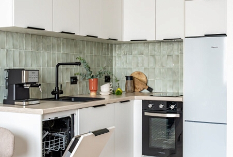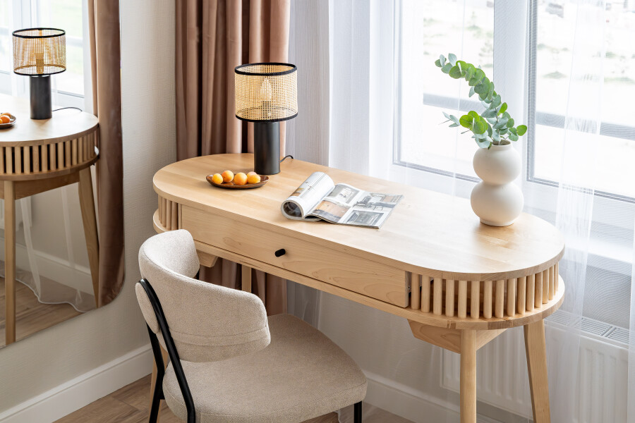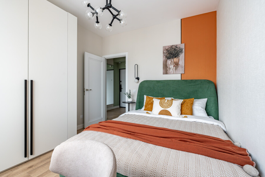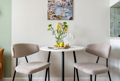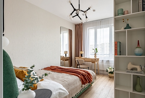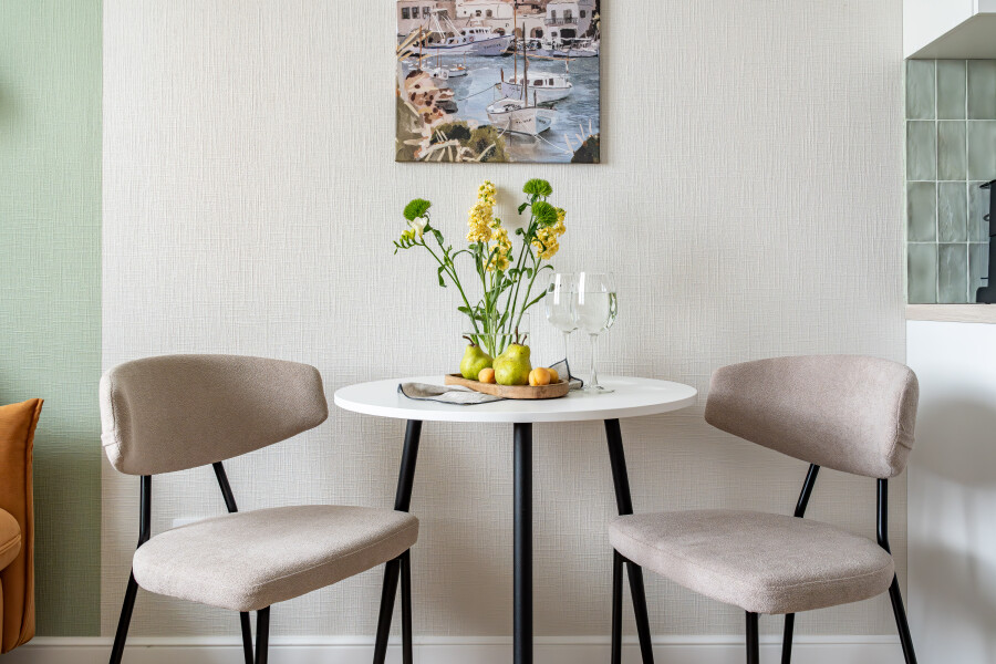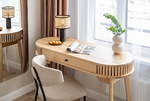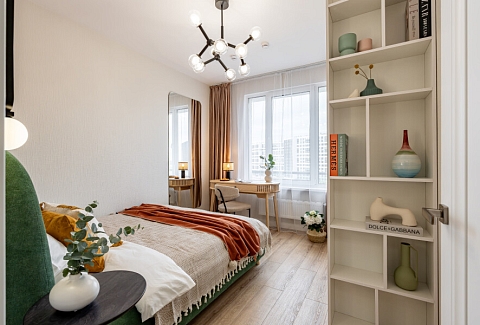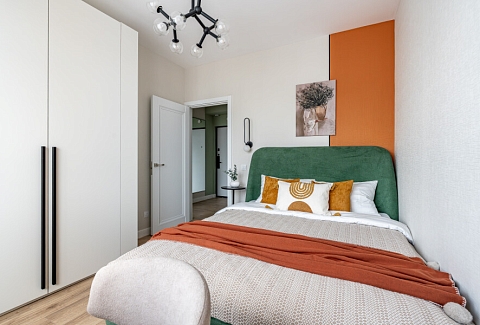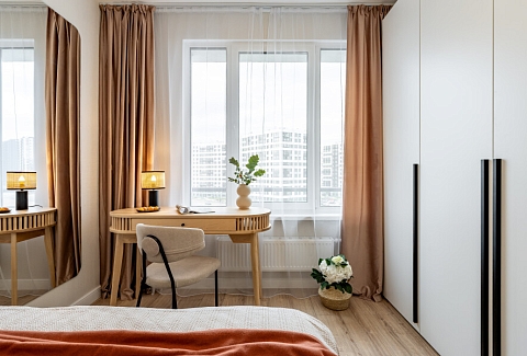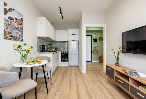 В номере: вешалка, диван раскладной, зеркало, прикроватный столик, стол для компьютера, стол обеденный, стулья, шкаф, гладильная доска, духовой шкаф, микроволновая печь, набор посуды, плита индукционная, посудомоечная машина, стиральная машина, сушилка для белья, телевизор ЖК, холодильник, чайный набор посуды, электрочайник