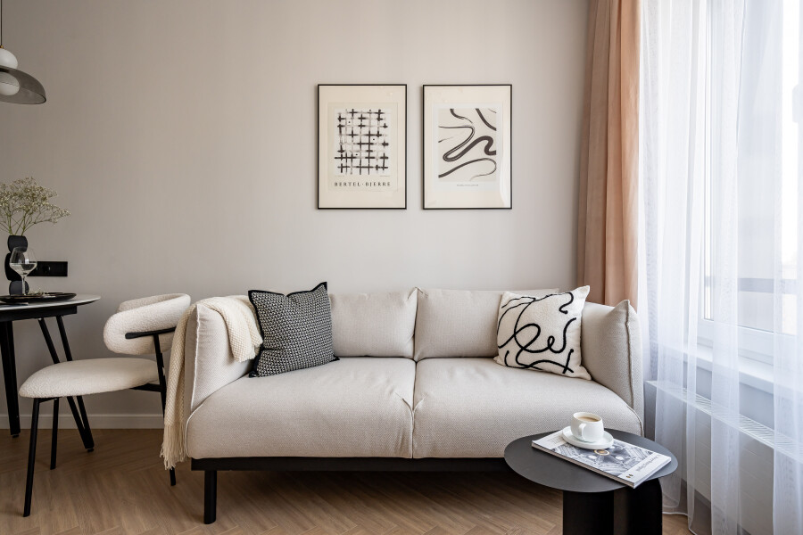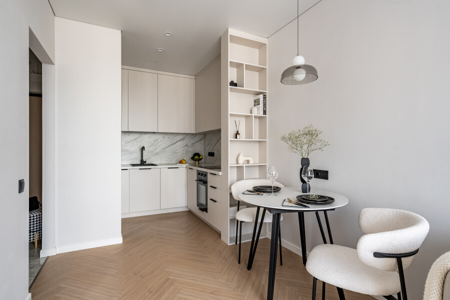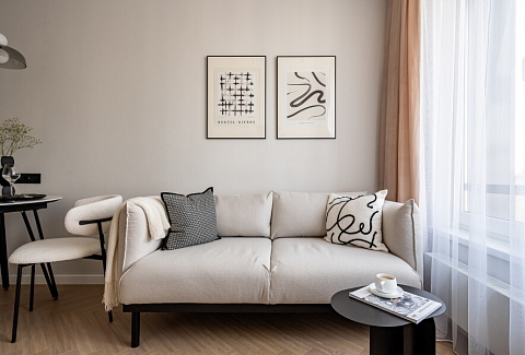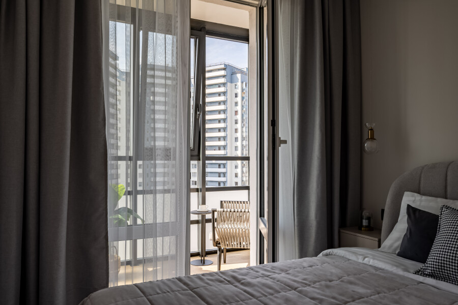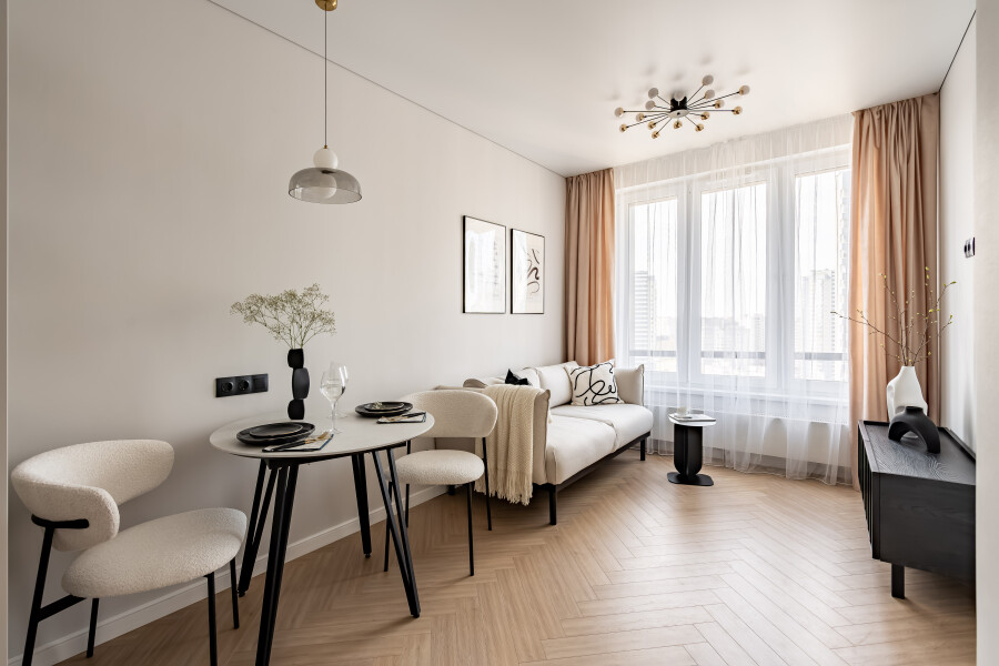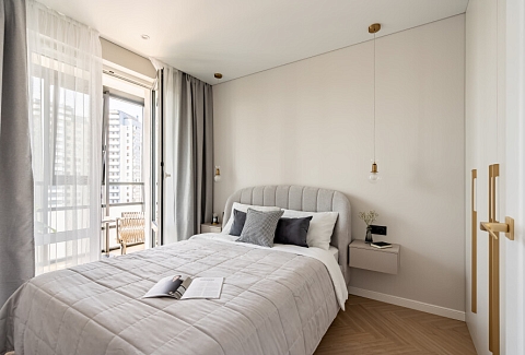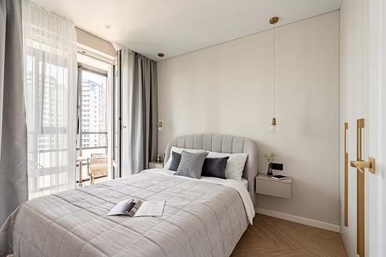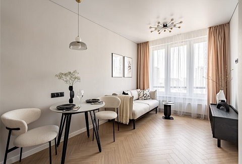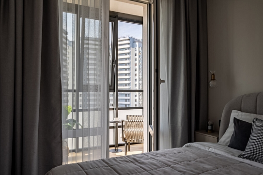Благоустроены дворы, работают магазины, кафе, бассейн.Изолированная спальня располагает двуспальной кроватью, панорамным остеклением, выходом на видовой балкон с уютной лаундж-зоной. В кухне-гостиной обустроено функциональное пространство для приготовления еды, установлены обеденный стол, мягкие стулья, диван. Прихожая оснащена вместительным шкафом и большим зеркалом. Совмещенный санузел укомплектован душевой и стиральной машиной. Для гостей предусмотрено подключение к Wi-Fi. По согласованию возможно размещение с домашним животным.