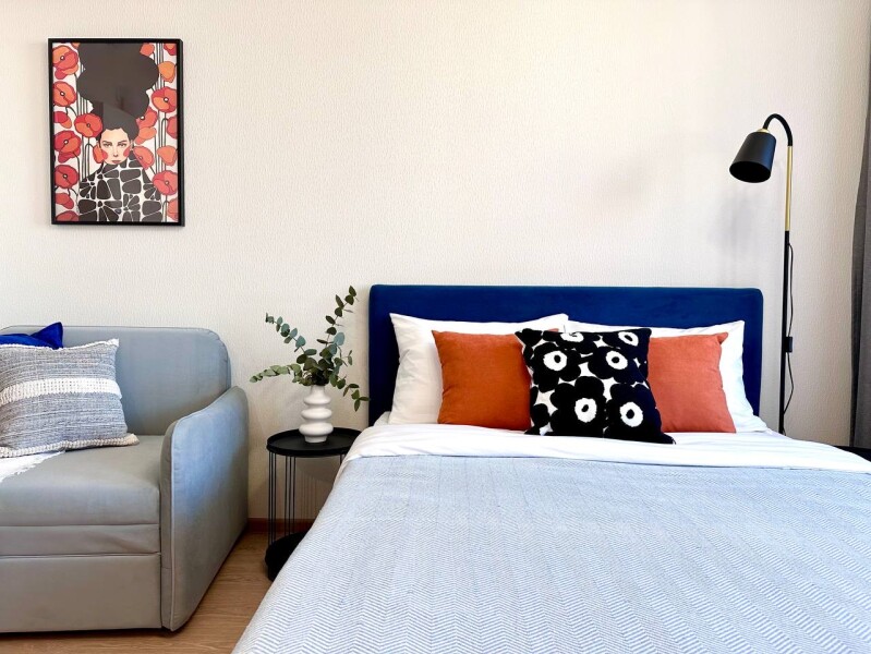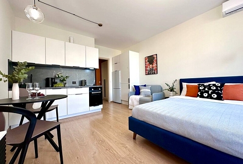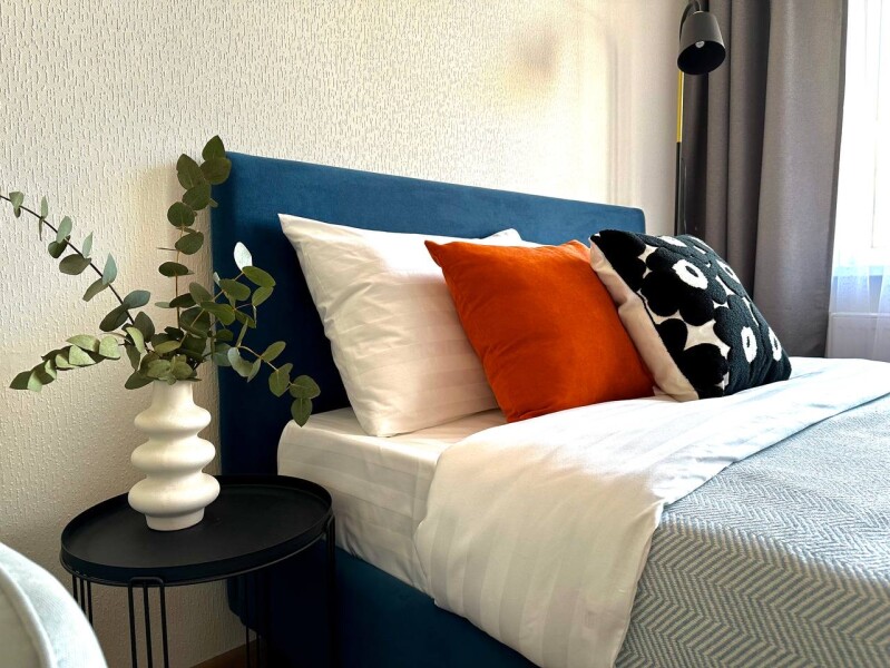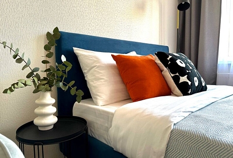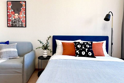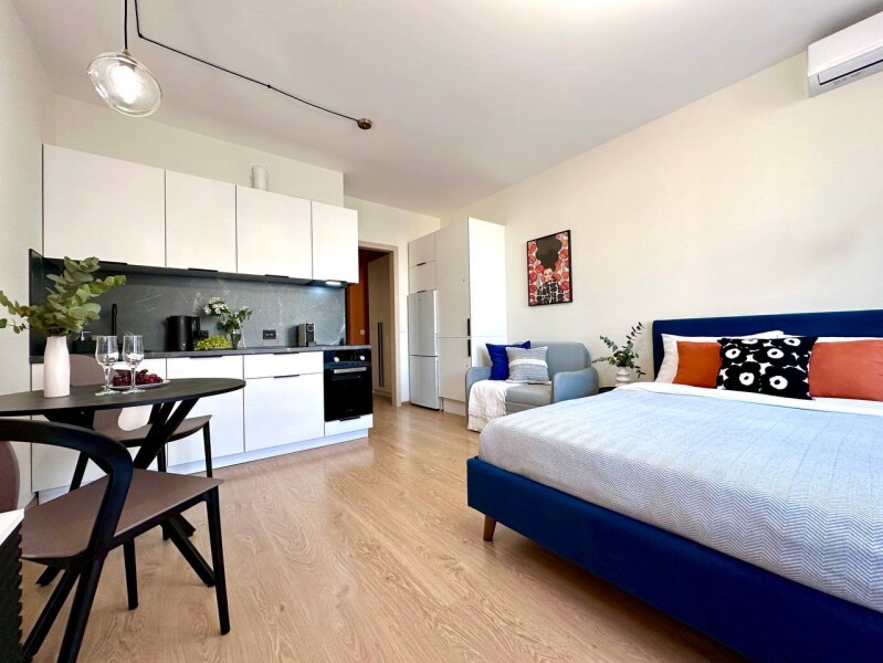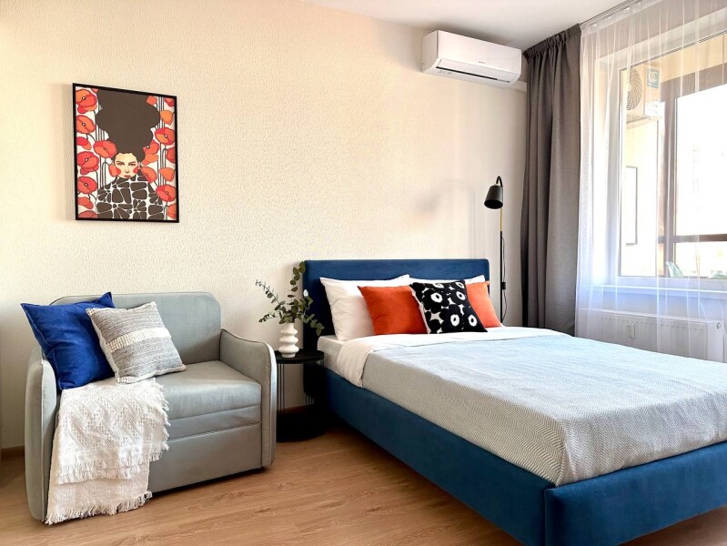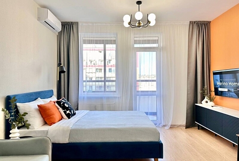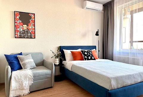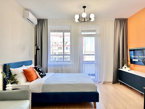 Во дворах развита инфраструктура: установлены детские игровые комплексы, обустроены спортивные площадки, прогулочные зоны и автостоянки. В здании работают продуктовые магазины и кафе.Уютные апартаменты оформлены в нейтральной гамме и дополнены яркими цветовыми деталями. Пространства и света комнате добавляют большое окно и панорамное остекление. Жилая зона располагает двуспальной кроватью и креслом-кроватью в качестве дополнительного спального места. Кухонная часть укомплектована всем необходимым для приготовления еды, посудомоечной машиной, обеденной группой. На балконе оснащена небольшая лаундж-зона с плетеным креслом. В совмещенном санузле имеются душевая кабина и стиральная машина. В студии предусмотрено много мест для хранения вещей. Для гостей доступны Wi-Fi и Smart TV. Возможен заезд с домашним животным.