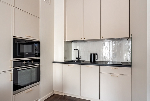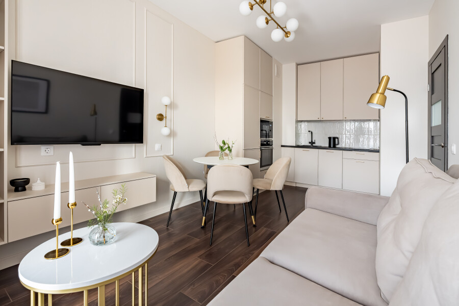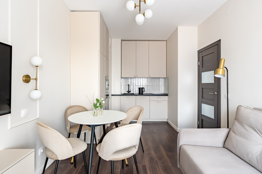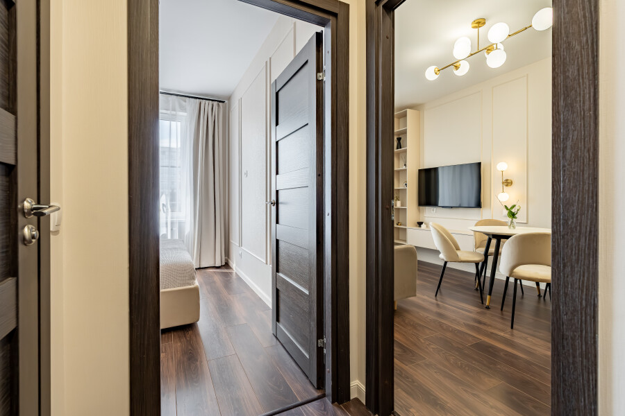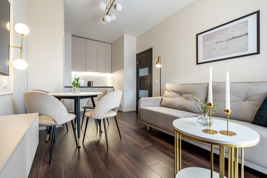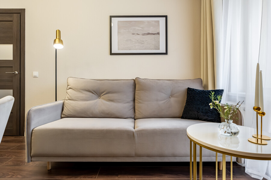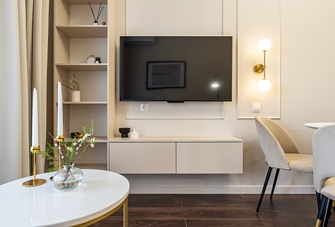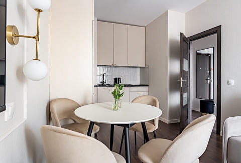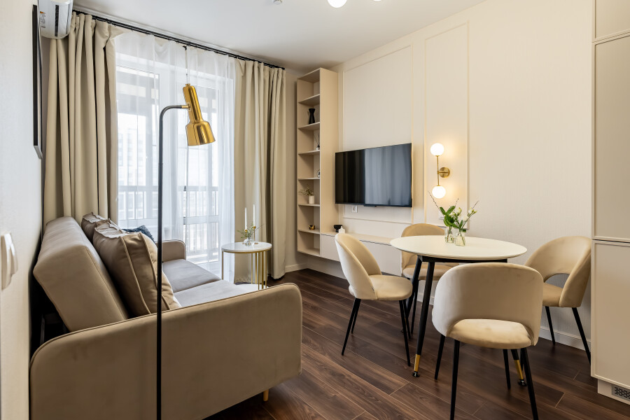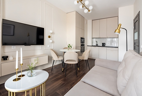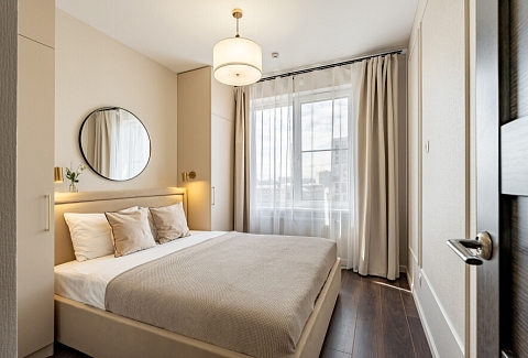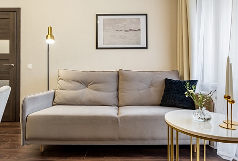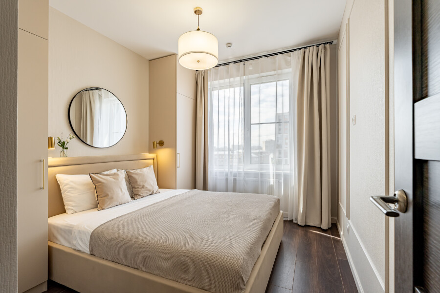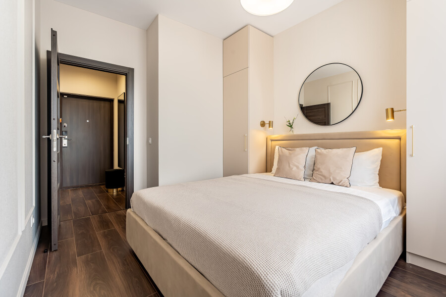 В номере: вешалка, диван раскладной, зеркало, кровать двуспальная, прикроватные тумбочки, столик журнальный, стол обеденный, стулья, шкаф-купе, гладильная доска, духовой шкаф, микроволновая печь, набор посуды, плита индукционная, стиральная машина, сушилка для белья, телевизор ЖК, утюг, холодильник, чайный набор посуды, электрочайник
