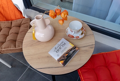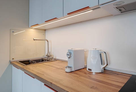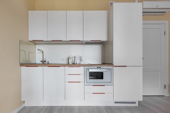 В номере: вешалка, зеркало, комод, кресло-кровать, кровать двуспальная, кухонная мебель, прикроватный столик, стол обеденный, стулья, шкаф, гладильная доска, духовой шкаф, кондиционер, кофемашина, микроволновая печь, набор посуды, плита индукционная, стиральная машина, сушилка для белья, телевизор ЖК, утюг, холодильник, чайный набор посуды, электрочайник