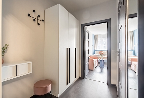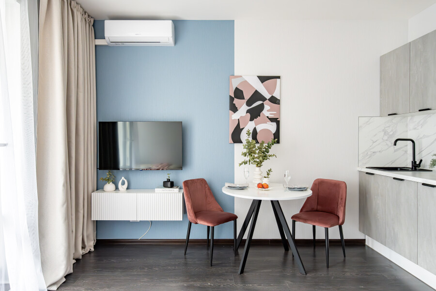 В номере: вешалка, диван, зеркало, кровать двуспальная, стол, стулья, шкаф, духовой шкаф, кондиционер, кофемашина, микроволновая печь, набор посуды, плита электрическая, стиральная машина, телевизор, утюг, холодильник, электрочайник