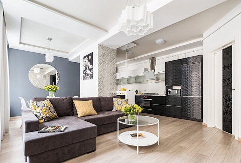 В номере: вешалка, диван раскладной, зеркало, кресла, кровать двуспальная, прикроватные тумбочки, стол, стулья, шкаф, гладильная доска, духовой шкаф, кондиционер, микроволновая печь, набор посуды, плита электрическая, посудомоечная машина, стиральная машина, телевизор, утюг, холодильник, электрочайник