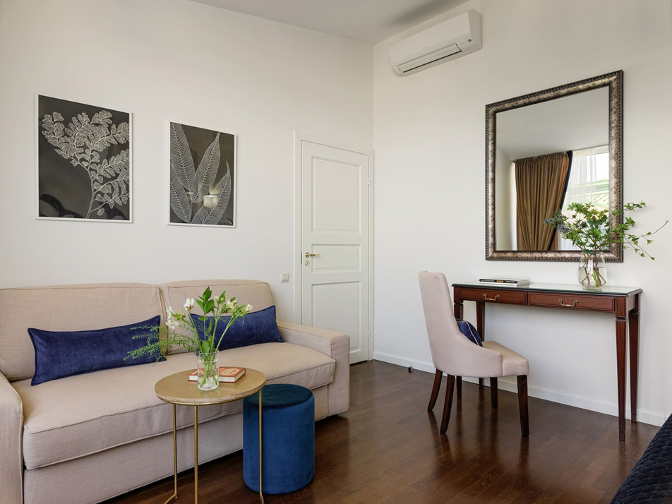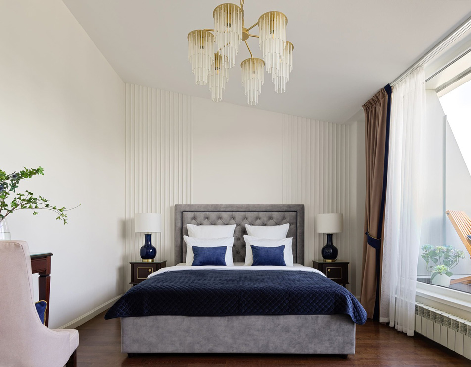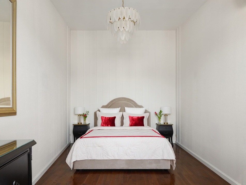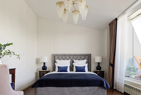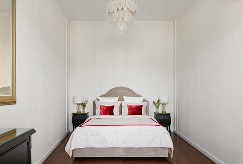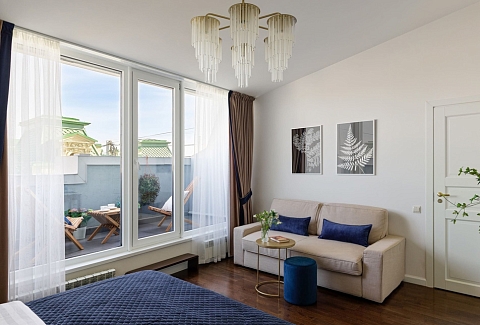 В номере: вешалка, диван раскладной, зеркало, кровать двуспальная, прикроватные тумбочки, стол, стулья, шкаф, духовой шкаф, кондиционер, микроволновая печь, набор посуды, плита газовая, посудомоечная машина, стиральная машина, телевизор, холодильник, электрочайник
