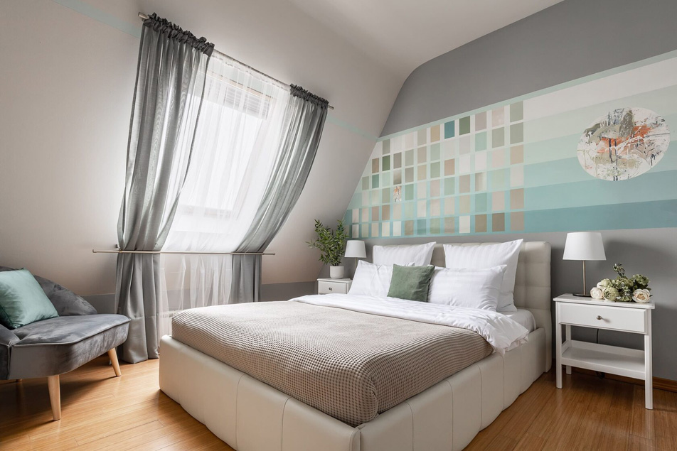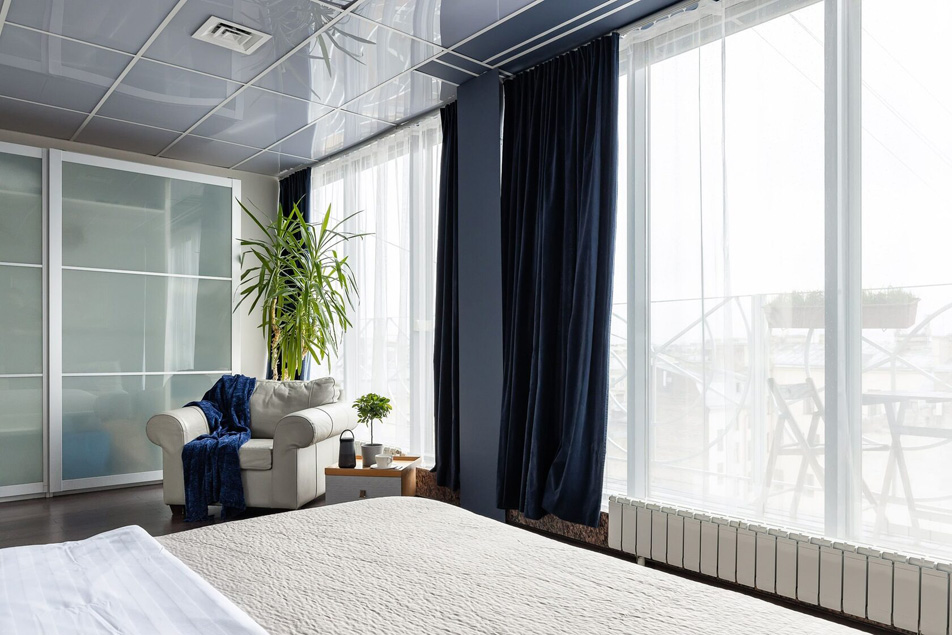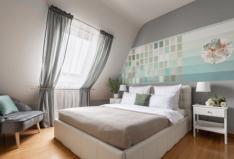 В номере: вешалка, диван, зеркало, кресла, кровать двуспальная, прикроватные тумбочки, стол, стулья, шкаф, кондиционер, микроволновая печь, набор посуды, плита газовая, посудомоечная машина, стиральная машина, телевизор, холодильник, электрочайник