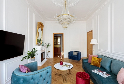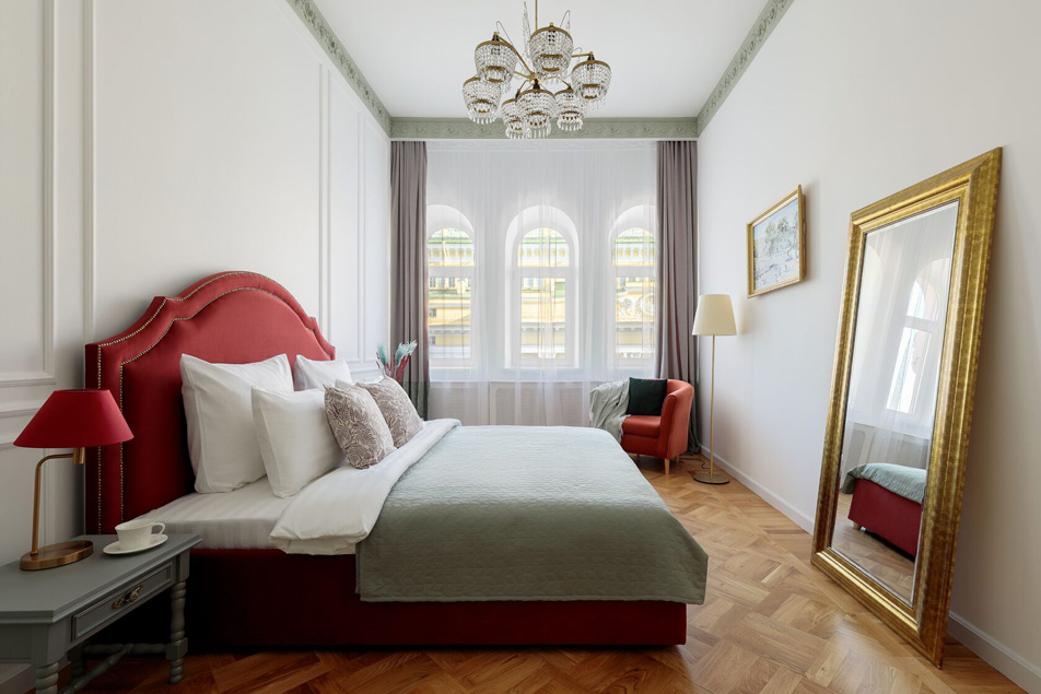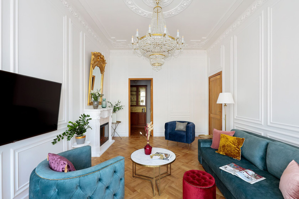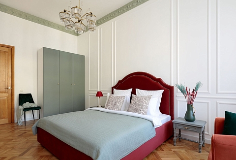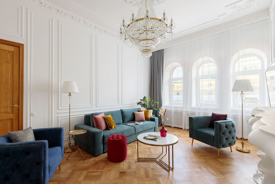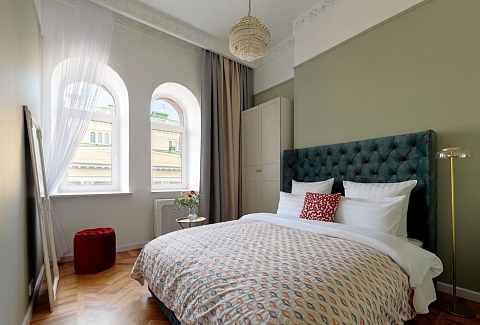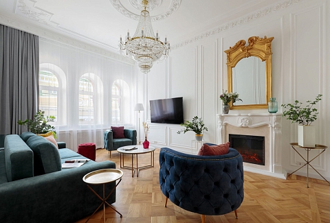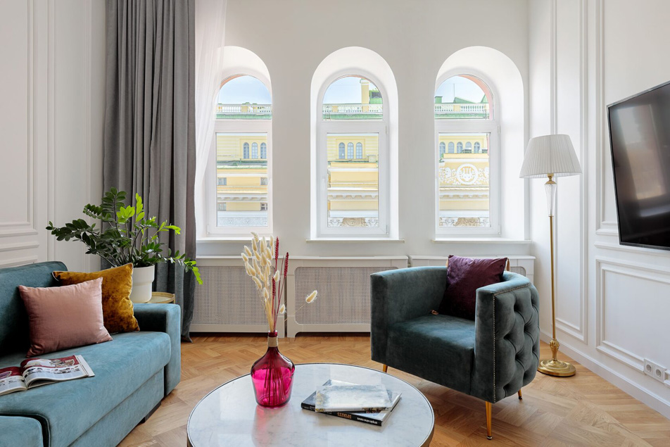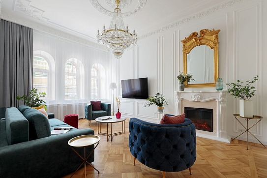 Исключительные апартаменты, оформленные в духе неоклассики, придутся по вкусу поклонникам петербургского стиля. Просторная площадь 130 м2 включает три изолированные спальни, две ванные комнаты, оборудованные сауной, кухню, гостиную и арочные окна, открывающие захватывающий вид на Александринский театр, творение Карла Росси. Расположены в тихом, спокойном центре города.Из окон открывается вид на Невский проспект.