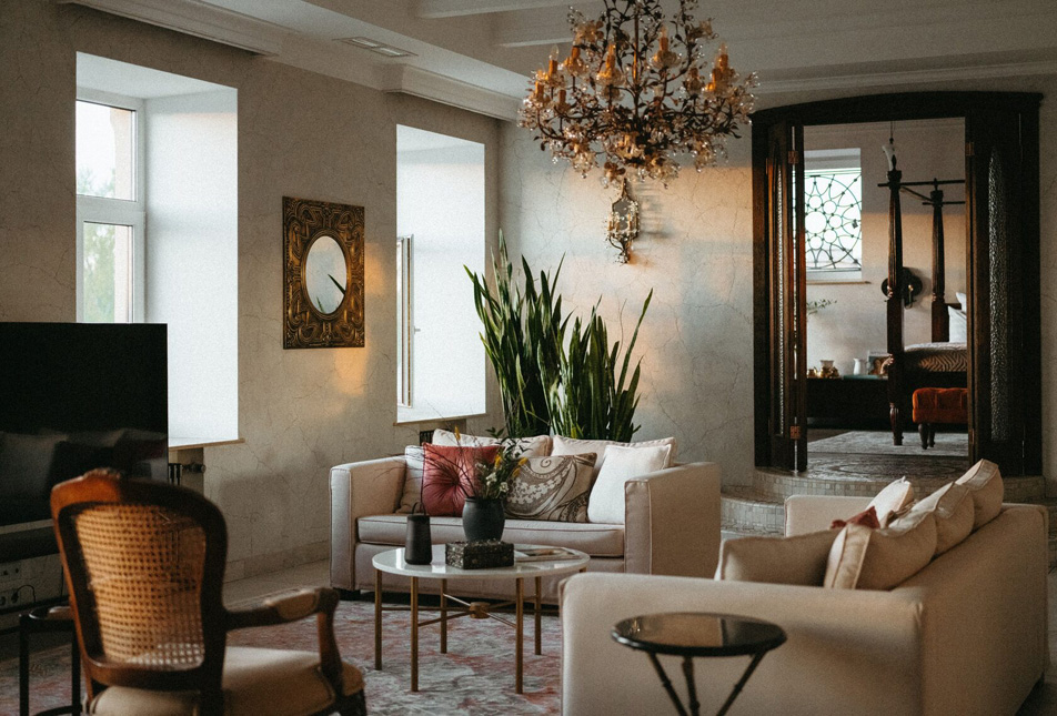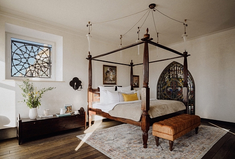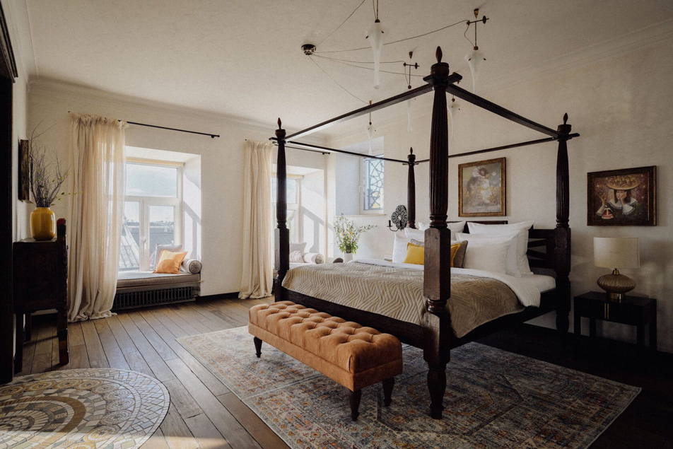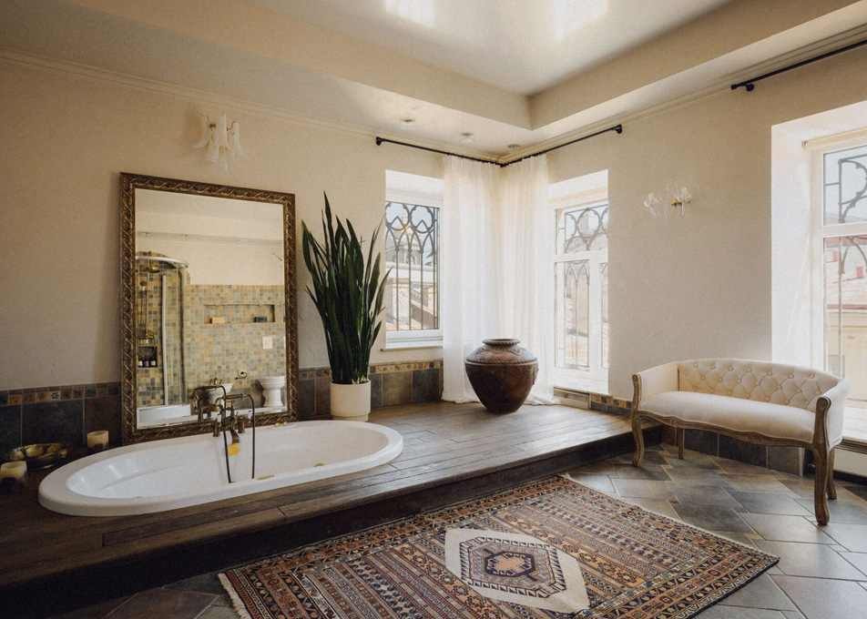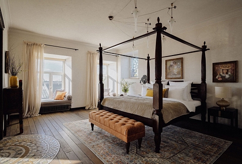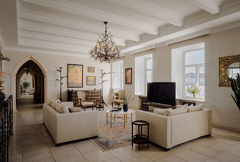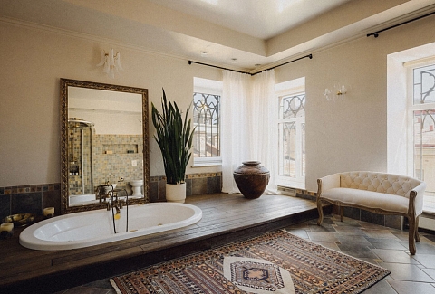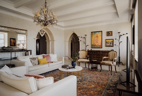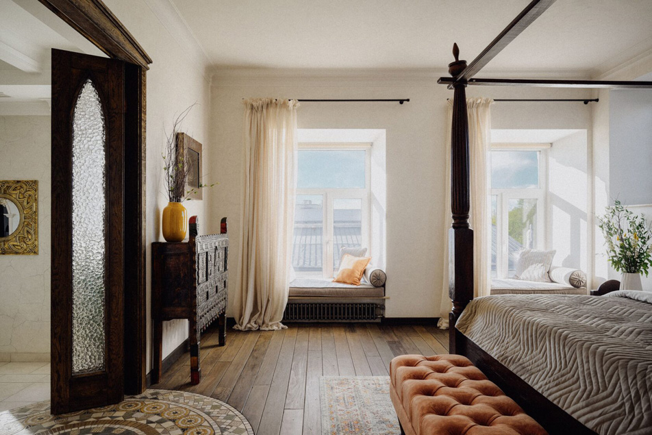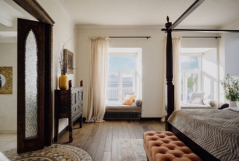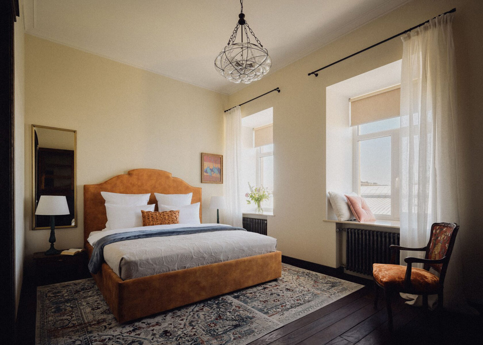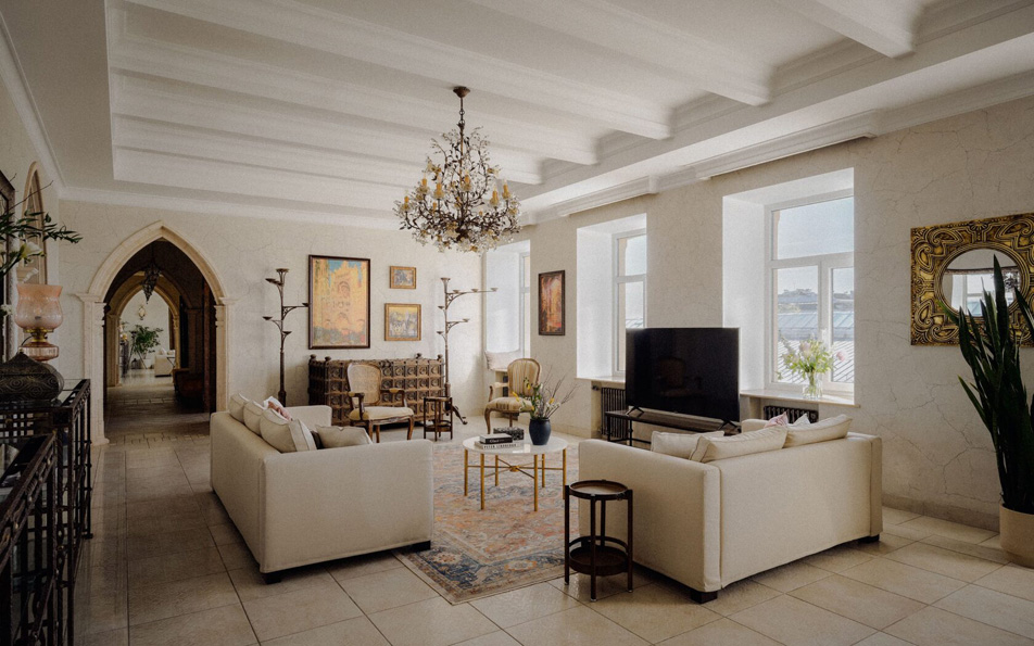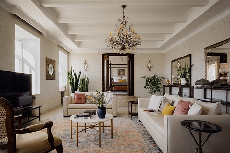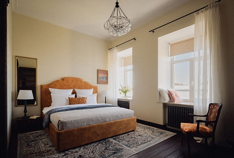 В одном из самых впечатляющих зданий Санкт-Петербурга расположились апартаменты, оформленные в готическом стиле. Кованая мебель премиум-класса и атмосфера средневекового замка переносят в другую эпоху. Панорамные окна открывают потрясающий вид на Адмиралтейскую иглу и золоченые купола Исаакиевского собора.Продуманная планировка включает две отдельные спальни, два санузла, просторную гостиную и кухонную зону.