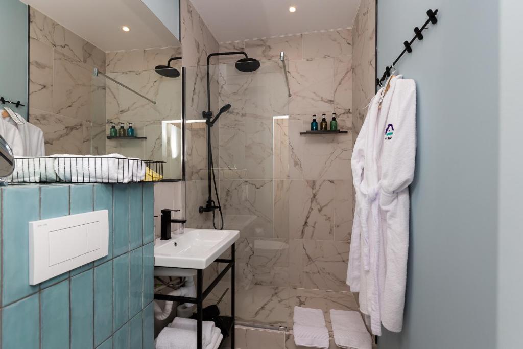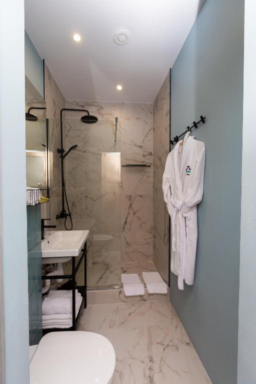 Санузел: с душем, тапочки, туалетные принадлежности, фен, халат