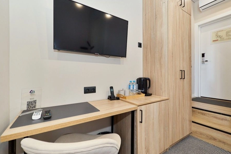В номере: вешалка, зеркало, кровать двуспальная, прикроватные тумбочки, стол, стул, шкаф, кондиционер, мини-холодильник, набор посуды, сейф, телевизор, чайная станция