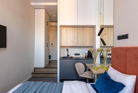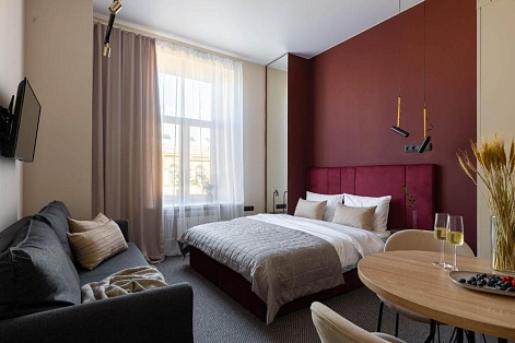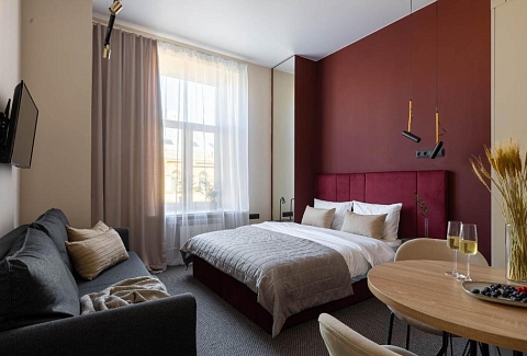В номере: вешалка, диван, зеркало, кровать двуспальная, прикроватные тумбочки, стол, стулья, шкаф, кондиционер, мини-холодильник, набор посуды, телевизор, чайная станция, электрочайник