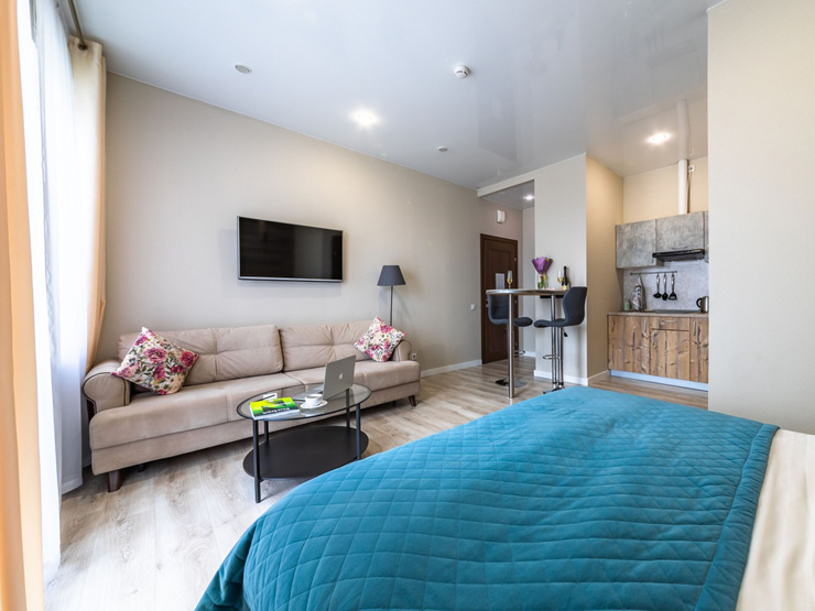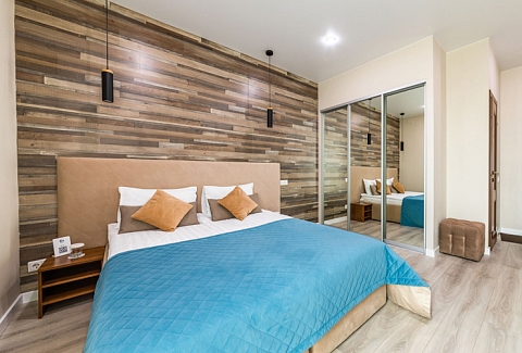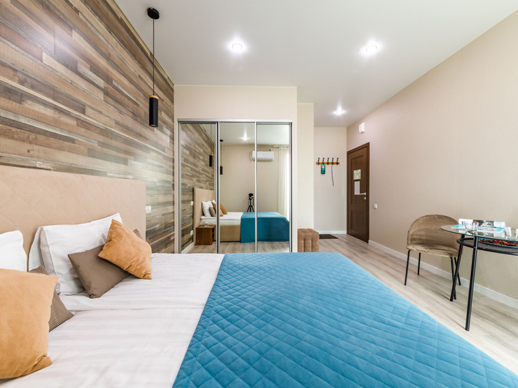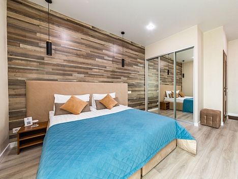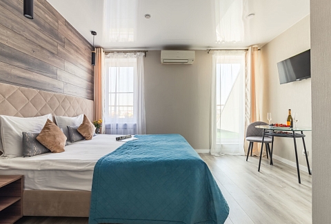 В номере: вешалка, зеркало, кровати односпальные /одна двуспальная кровать, прикроватные тумбочки, стол, стулья, шкаф, кондиционер, мини-холодильник, набор посуды, плита электрическая, сейф, телевизор, телефон