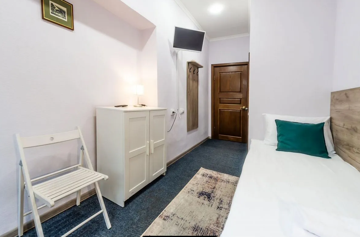 В номере: вешалка, комод, кровать полутороспальная, стулья,