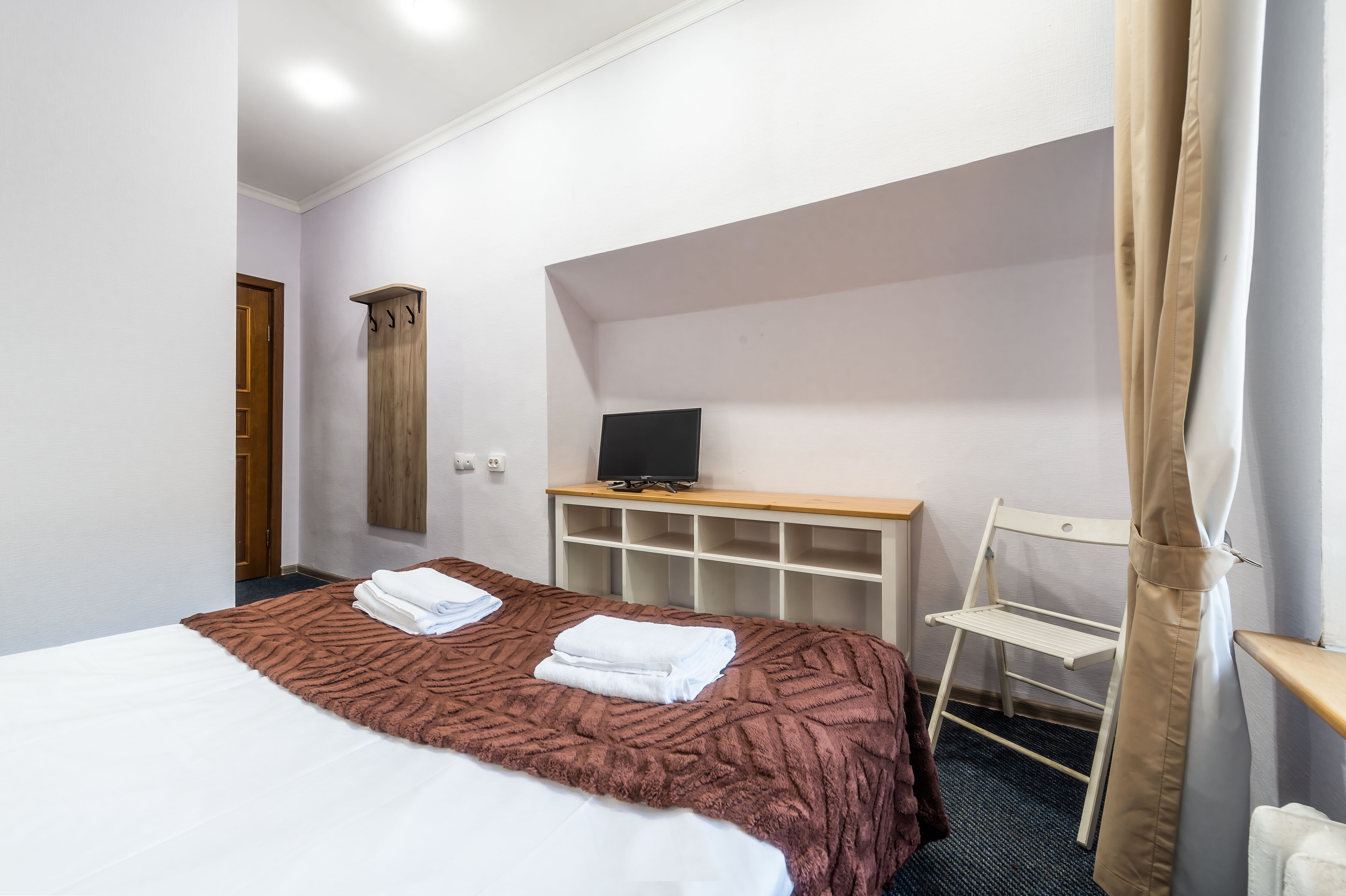 В номере: вешалка, зеркало, кровать двуспальная, прикроватные столики, стул, тумба, телевизор