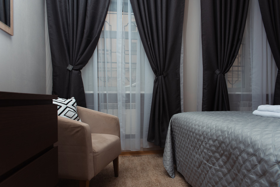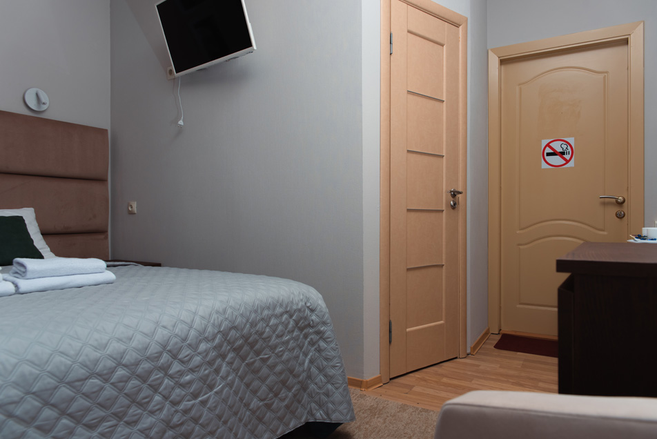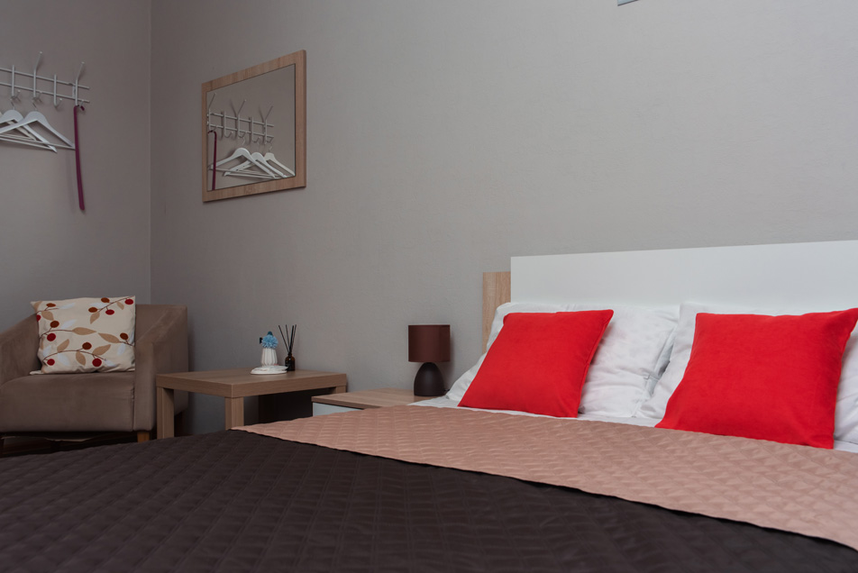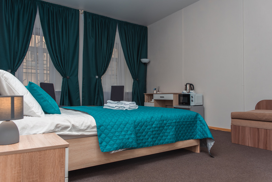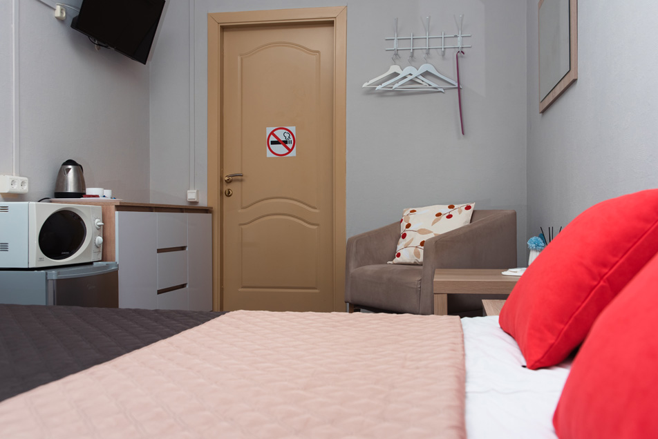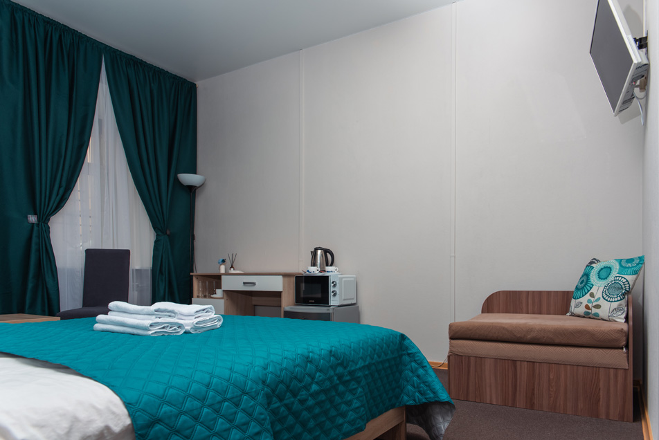 В номере: вешалка, зеркало, кресло, кровать двуспальная, прикроватные тумбочки, стол, стулья, тахта, шкаф, микроволновая печь, мини-холодильник, набор посуды, телевизор, электрочайник