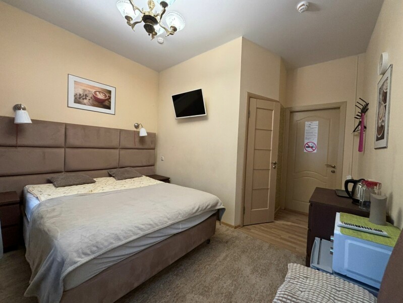 В номере: вешалка, комод, кровать двуспальная, прикроватные тумбочки, стол, стулья, микроволновая печь, мини-холодильник, набор посуды, телевизор, электрочайник