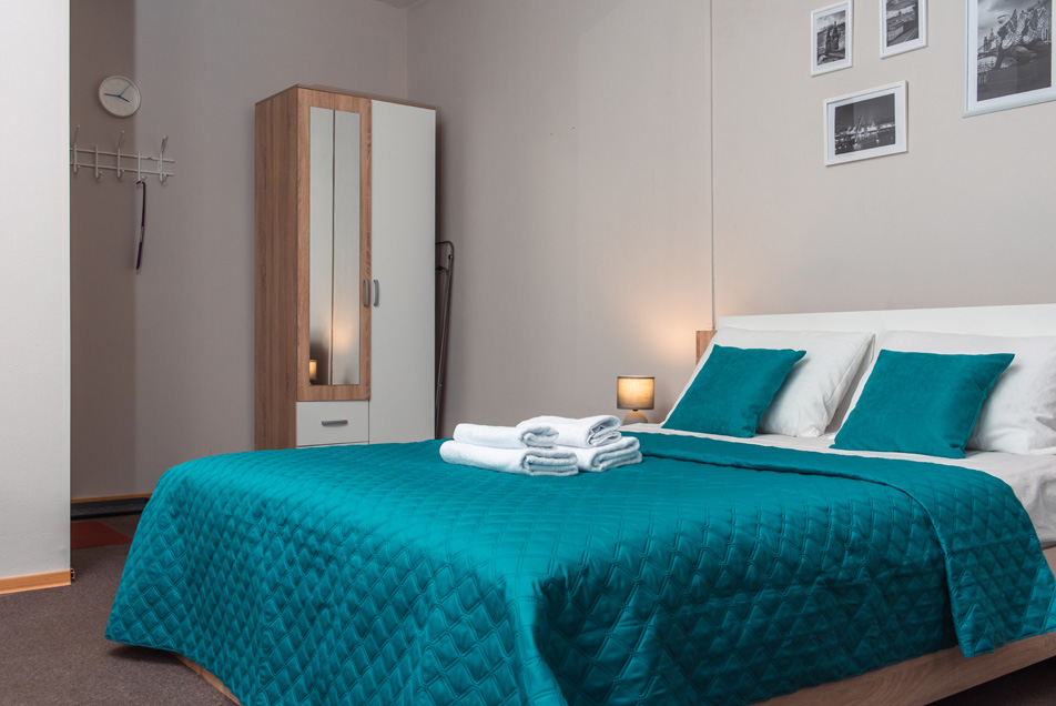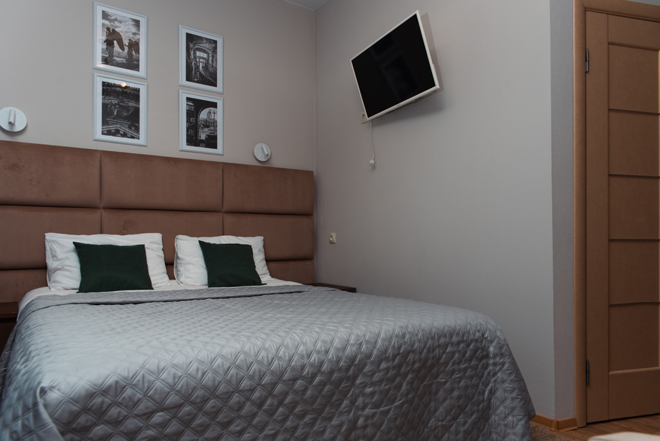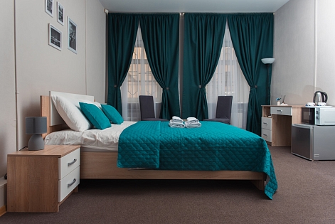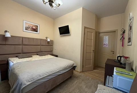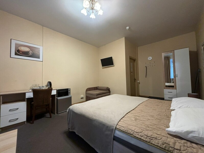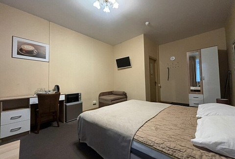В номере: вешалка, зеркало, комод, кровать двуспальная, прикроватные тумбочки, стол, стулья, микроволновая печь, мини-холодильник, набор посуды, телевизор, электрочайник