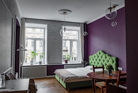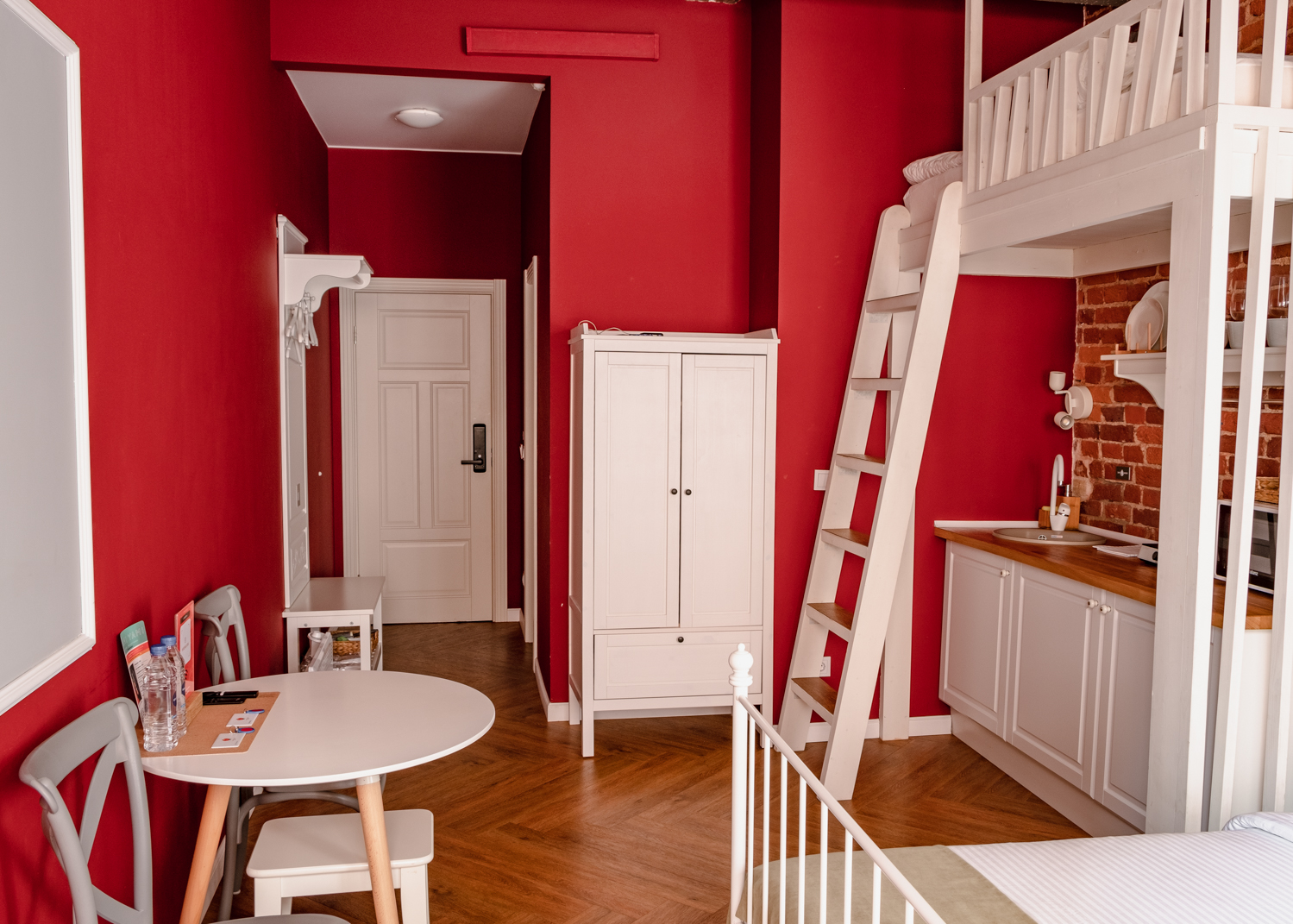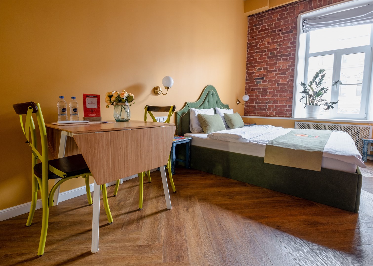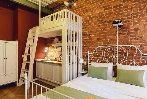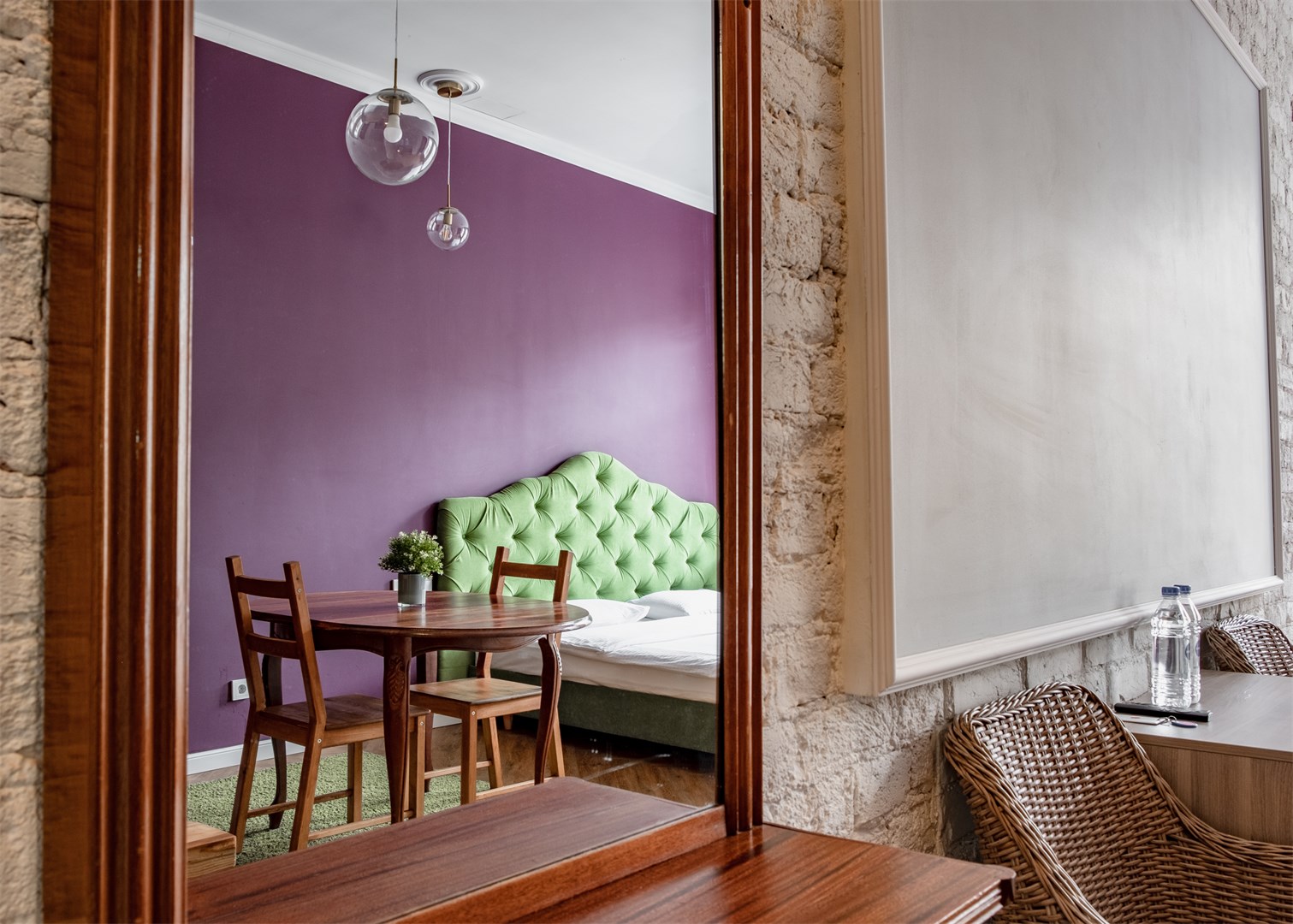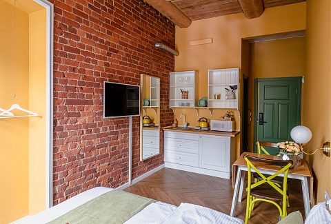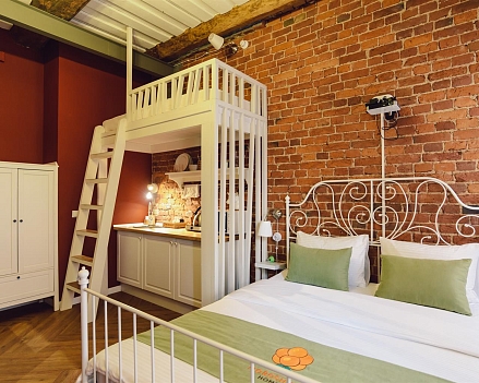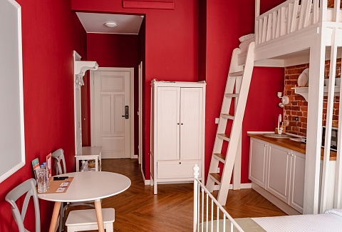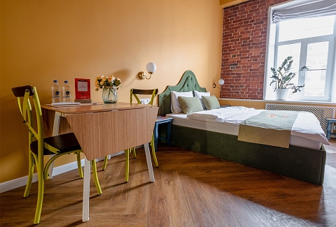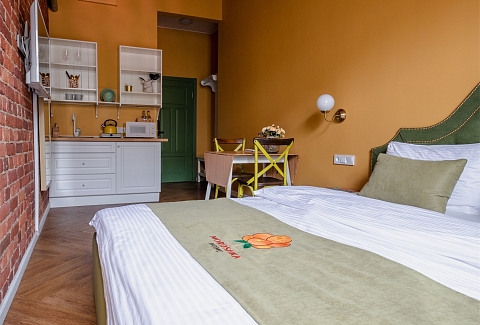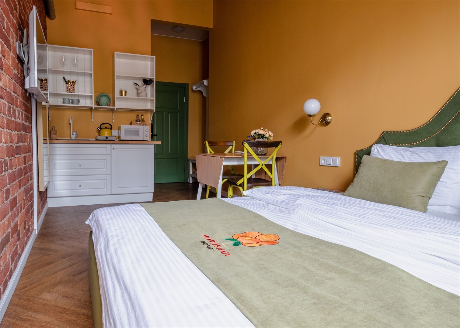 В распоряжении гостей 6 уютных номеров, оформленных в классическом стиле с добавлением элементов лофта. В каждом номере есть ванная комната, где гостей ожидают тапочки, халаты, наборы косметических принадлежностей, мини-кухня с электроплитой, плазменный телевизор со Смарт-ТВ и онлайн-кинотеатром. Номера повышенной комфортности укомплектованы оригинальной винтажной мебелью. Предусмотрена функция самостоятельного заселения, попасть в номер можно даже в позднее время суток. Среди услуг также беспроводной интернет, родители с малышами могут взять в аренду детские кроватки.