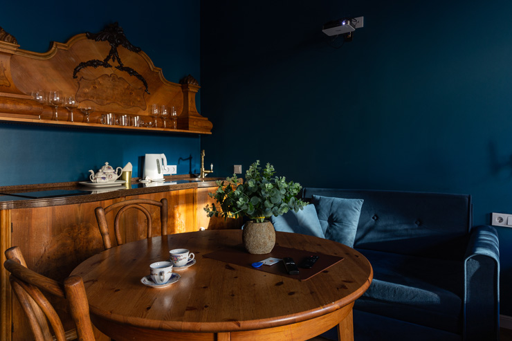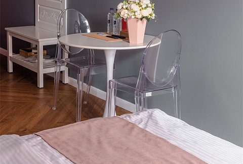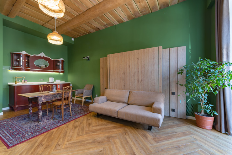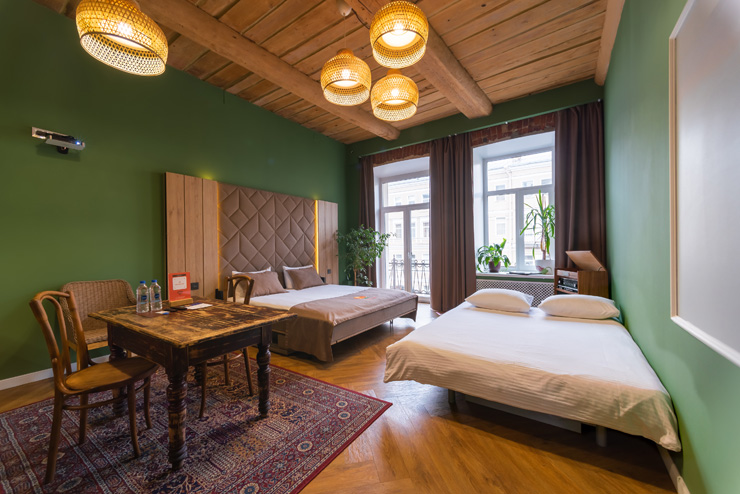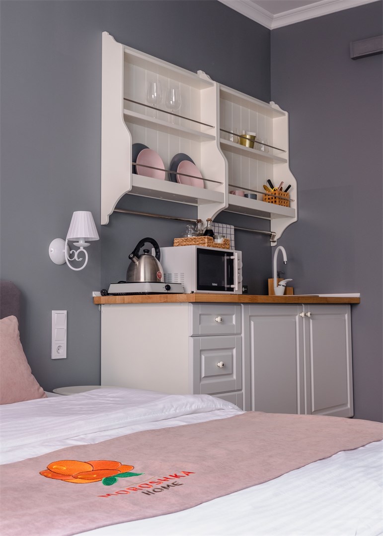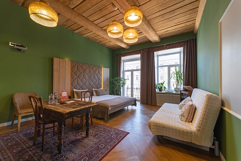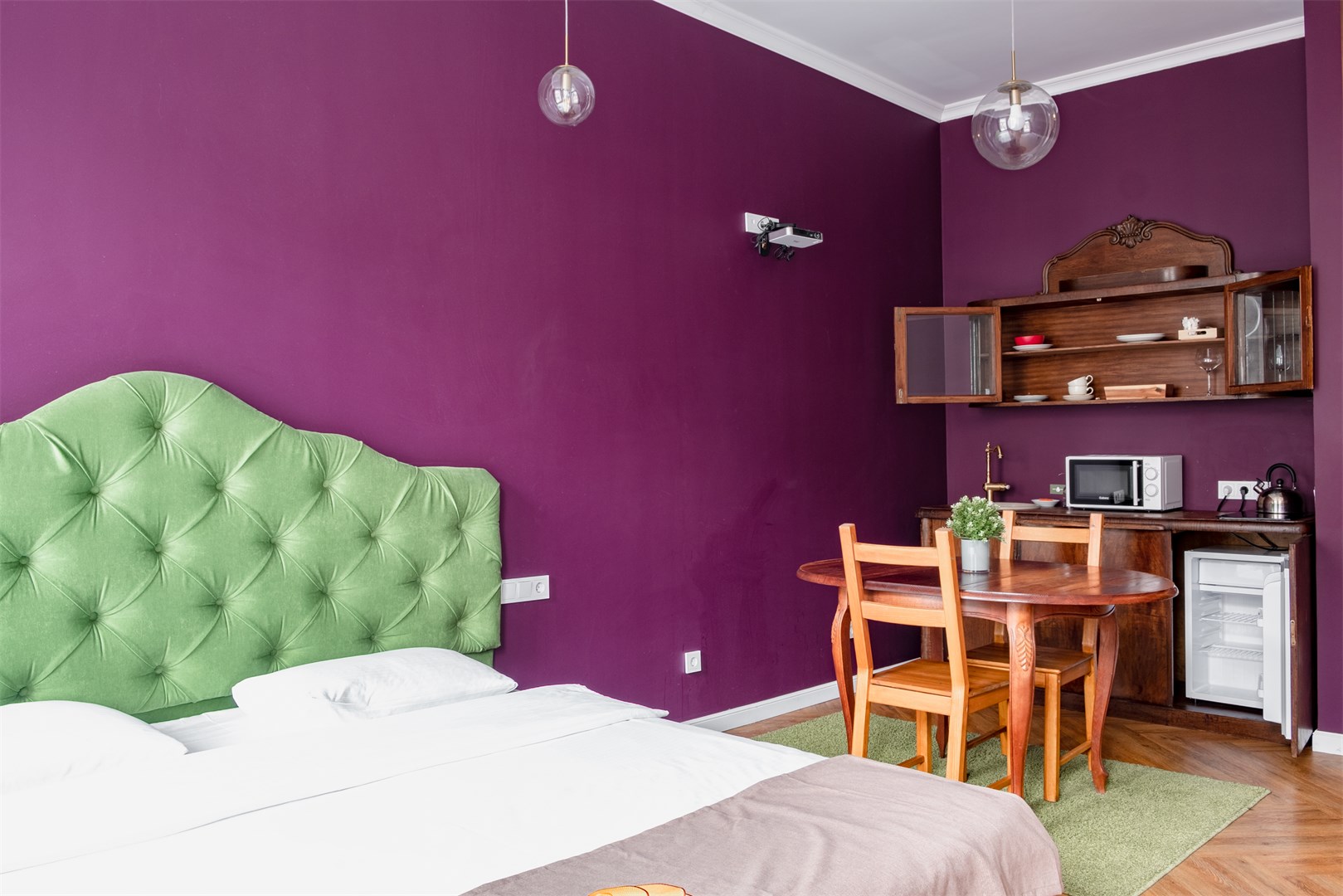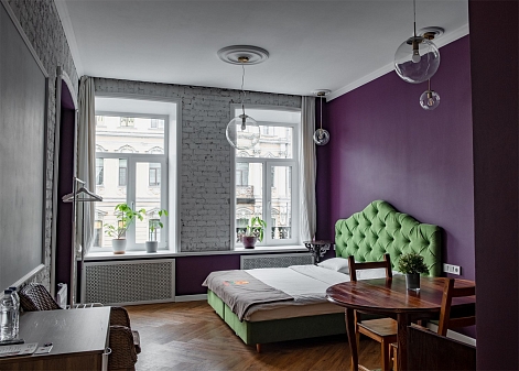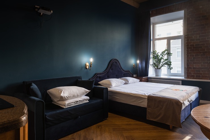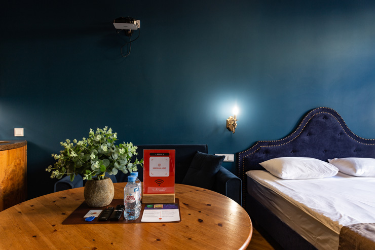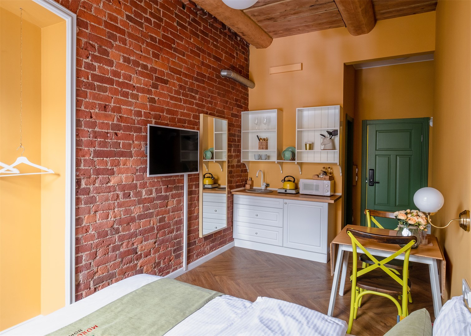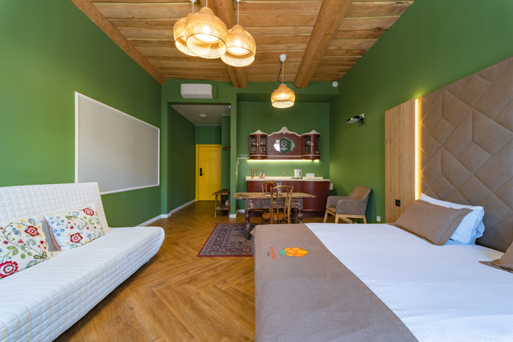 В распоряжении гостей 6 уютных номеров, оформленных в классическом стиле с добавлением элементов лофта. В каждом номере есть ванная комната, где гостей ожидают тапочки, халаты, наборы косметических принадлежностей, мини-кухня с электроплитой, плазменный телевизор со Смарт-ТВ и онлайн-кинотеатром. Номера повышенной комфортности укомплектованы оригинальной винтажной мебелью. Предусмотрена функция самостоятельного заселения, попасть в номер можно даже в позднее время суток. Среди услуг также беспроводной интернет, родители с малышами могут взять в аренду детские кроватки.