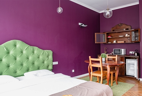В номере: вешалка, диван, зеркало, кровать двуспальная, прикроватные тумбочки, стол, стулья, шкаф, микроволновая печь, мини-холодильник, набор посуды, плита электрическая, телевизор, электрочайник