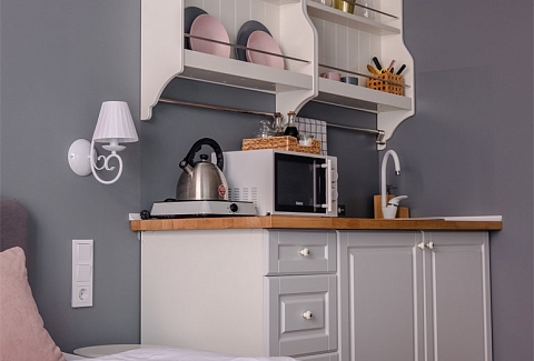 В номере: вешалка, зеркало, кровать двуспальная, прикроватные тумбочки, стол, стулья, шкаф, микроволновая печь, мини-холодильник, набор посуды, плита электрическая, телевизор, электрочайник
