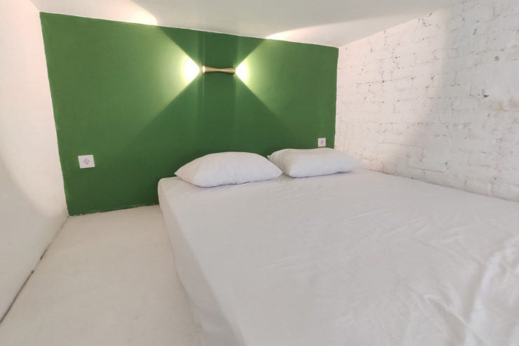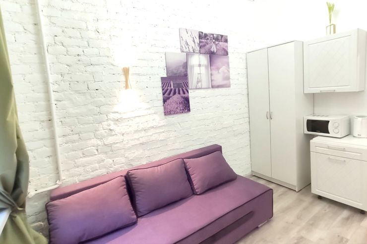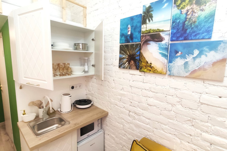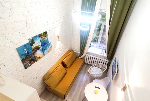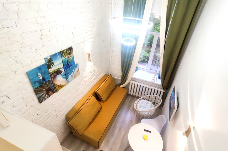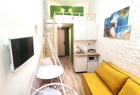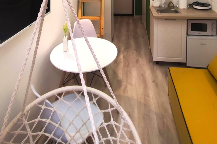 Продуктовый магазин и кафе открыты в здании напротив. Номерной фонд состоит из двух компактных, но функционально оснащенных студий с окнами на тихий внутренний двор. Каждые апартаменты оформлены в светлой цветовой гамме и дополнены яркими акцентными деталями. Оба варианта размещения располагают раскладным диваном, мини-кухней, собственным санузлом с душевой. Один номер дополнен подвесным креслом-качелями и двумя спальными местами на верхнем уровне. Во всей сети работает Wi-Fi.