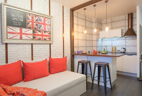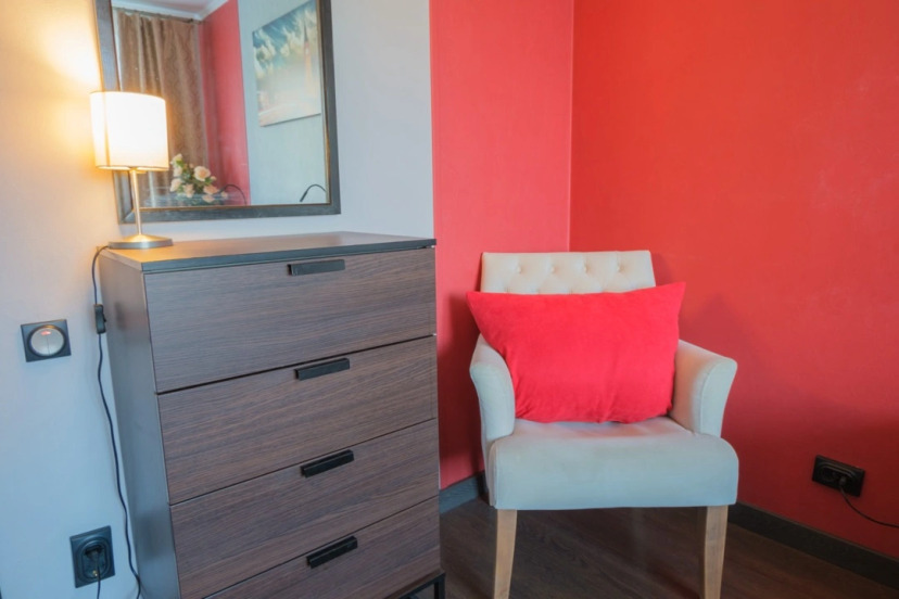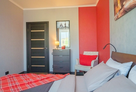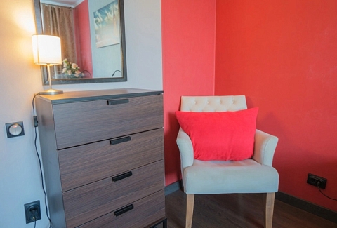 В номере: вешалка, диван раскладной, зеркало, комод, кресло, кровать двуспальная, прикроватные тумбочки, стол, стулья, шкаф, микроволновая печь, набор посуды, плита электрическая, стиральная машина, сушилка для белья, телевизор, холодильник, электрочайник